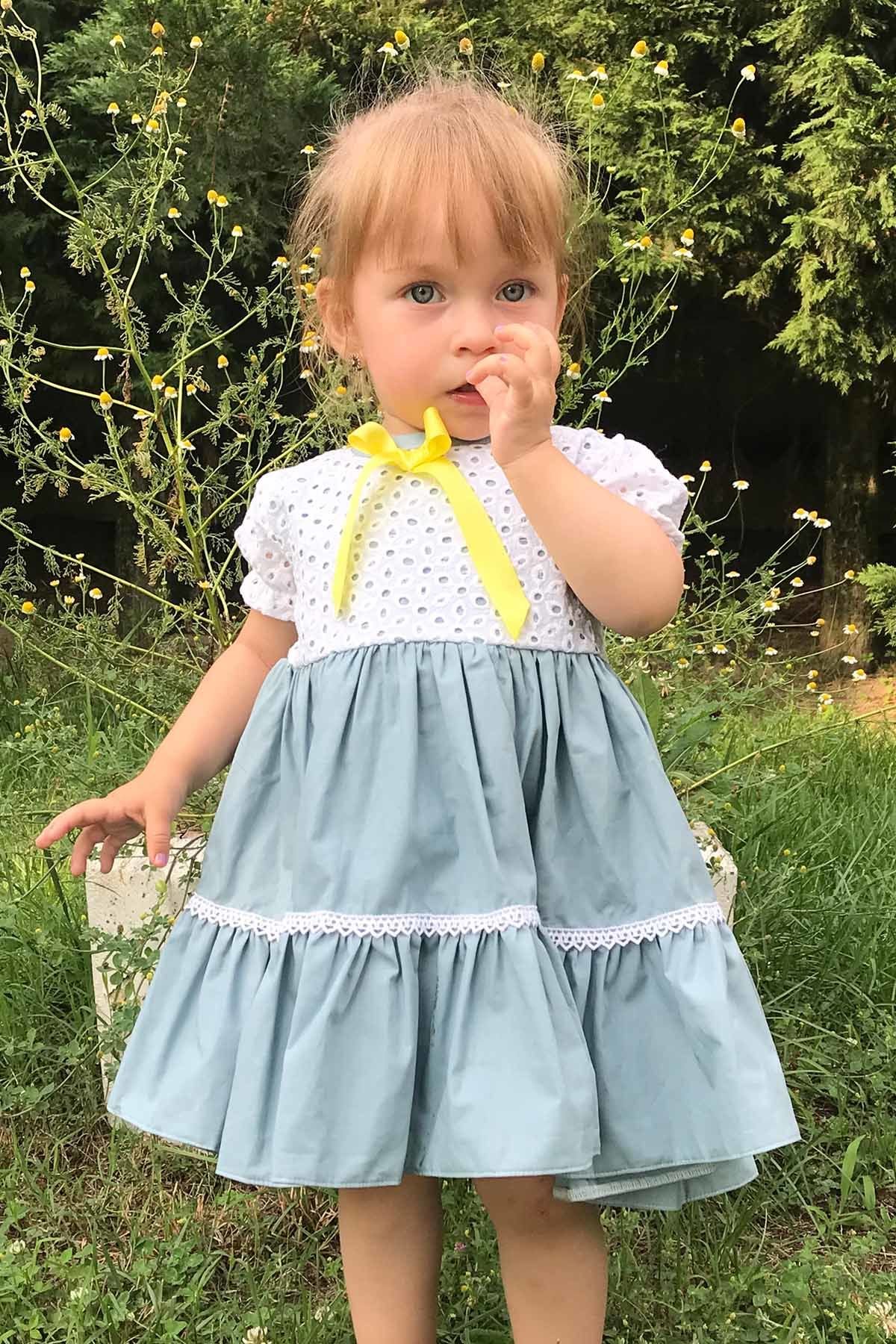 Kurdele Ve Dantel Detaylı Güpür Pamuklu Kumaş Mavi Kız Çocuk Bebek Elbise