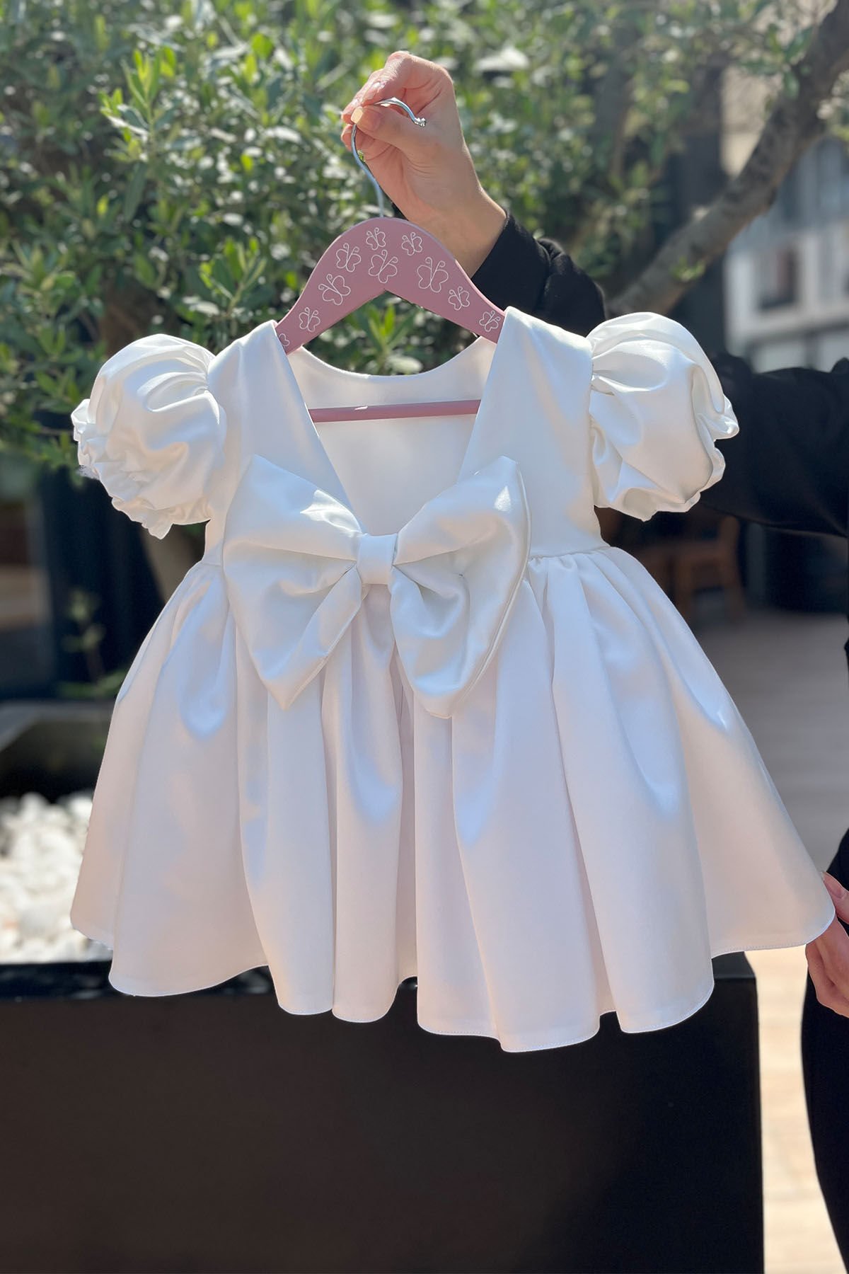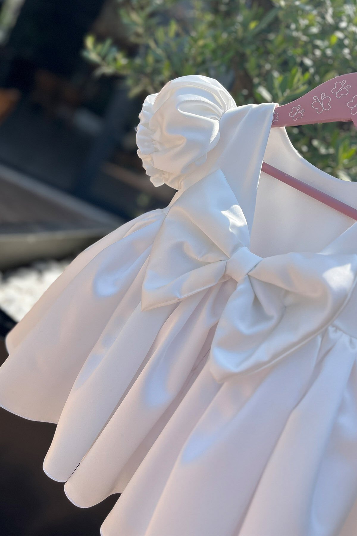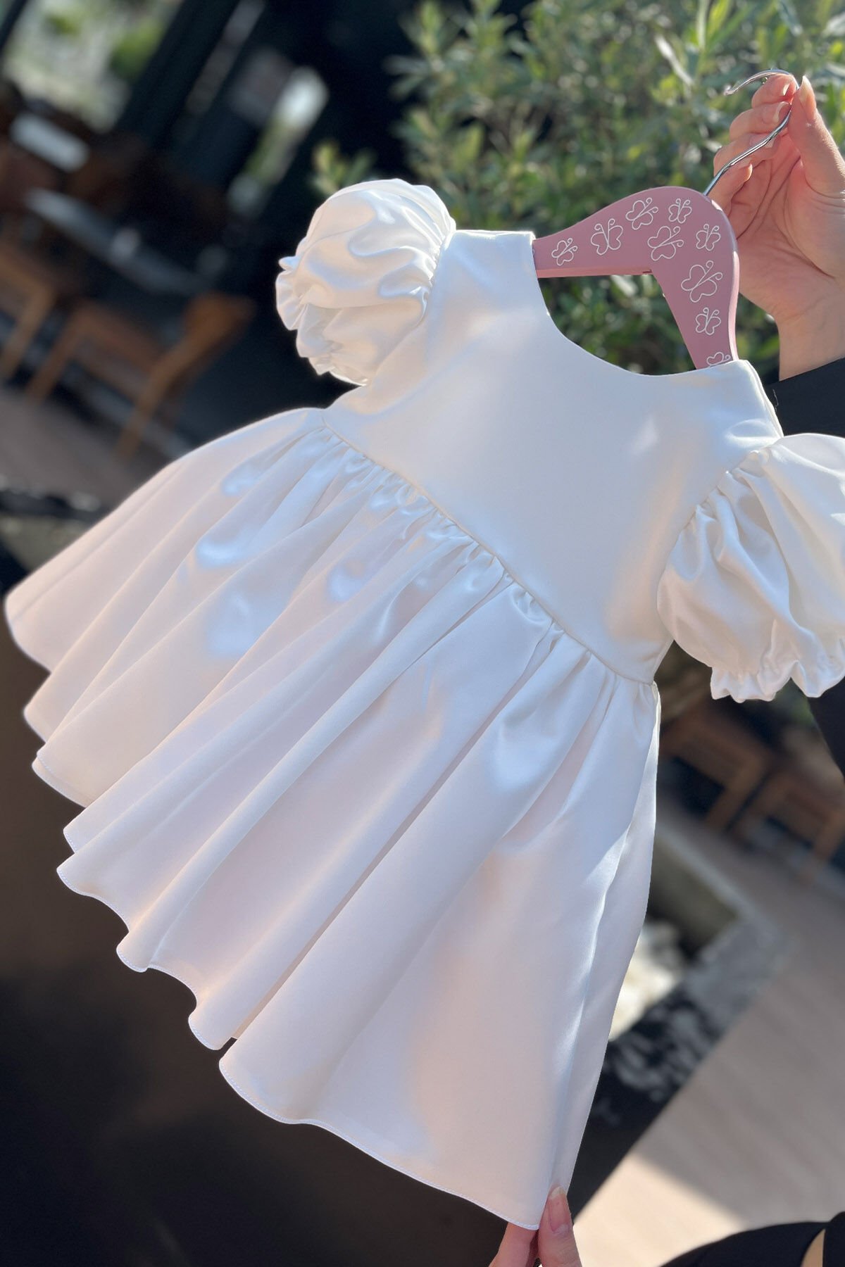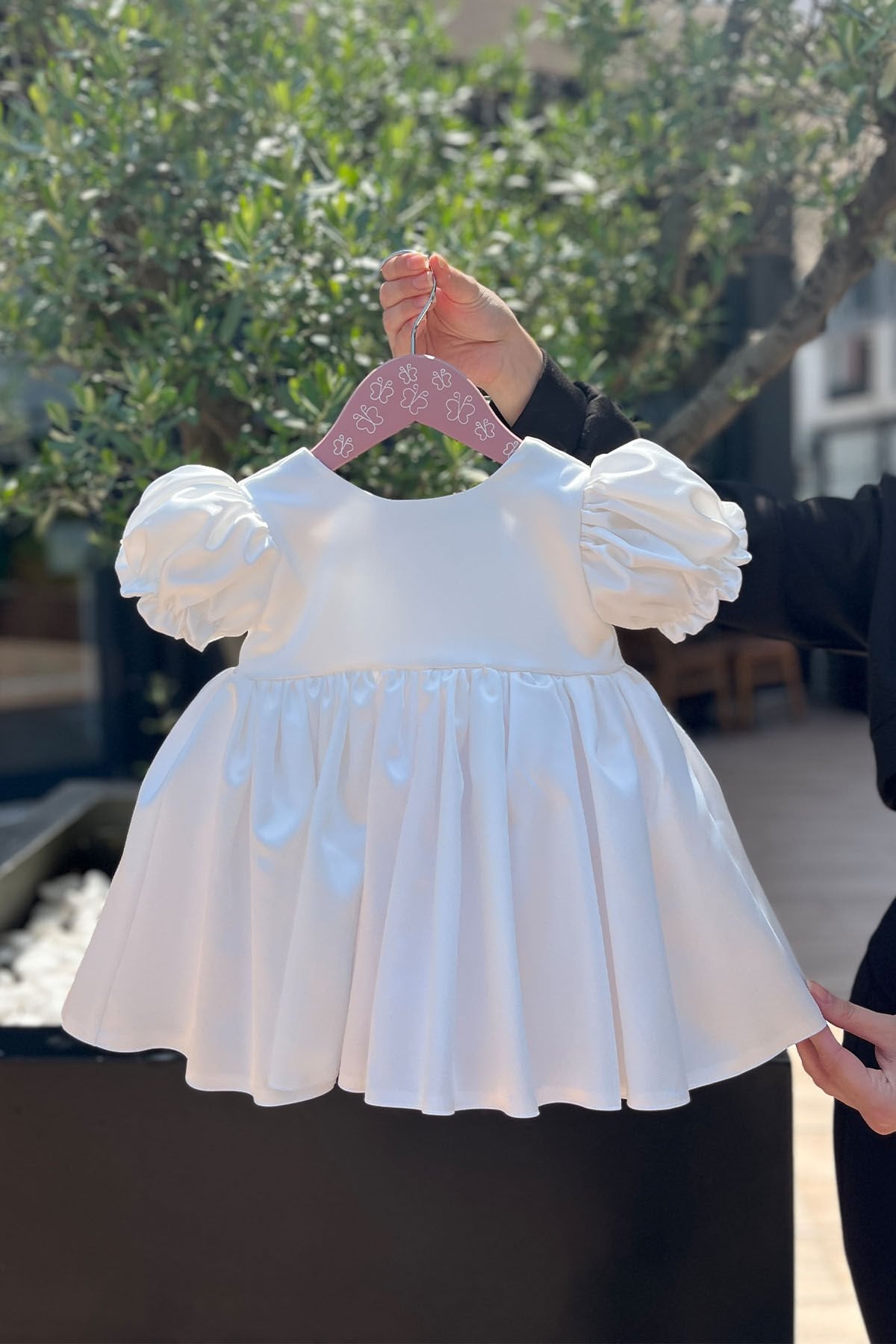 تمتزج الملمس اللامع للساتان مع نموذجنا البسيط واكتسب مظهرًا أنيقًا. بناءً على طلب الوالدين، استخدمنا بطانة داخلية من القطن بنسبة 100% ونقشنا التنورة بتول التارلاتان.