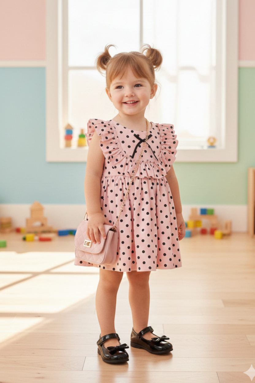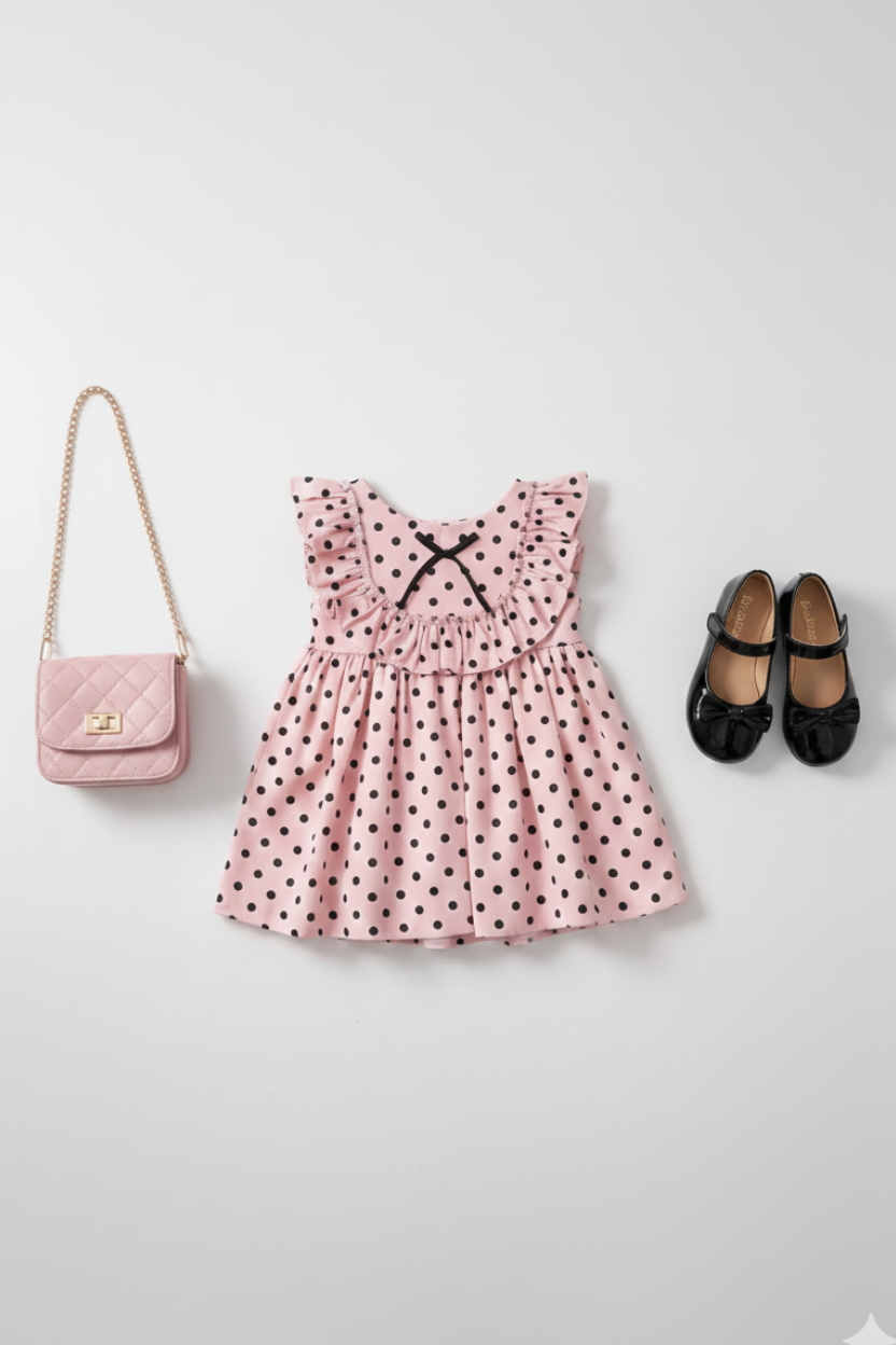 Unser rosa Kleid mit schwarzen Punkten besteht aus 100 % Baumwollstoff und bietet dank seiner weichen Textur ein angenehmes Tragegefühl.