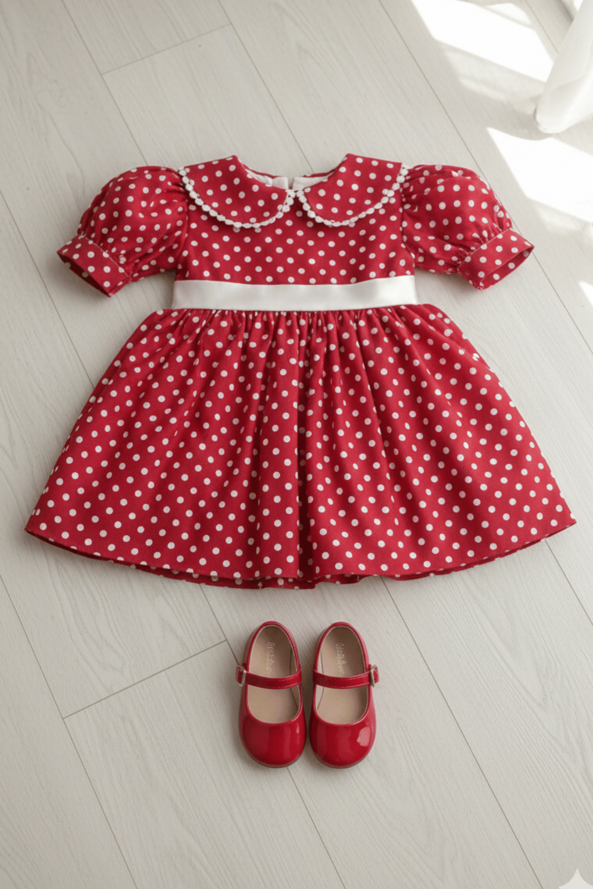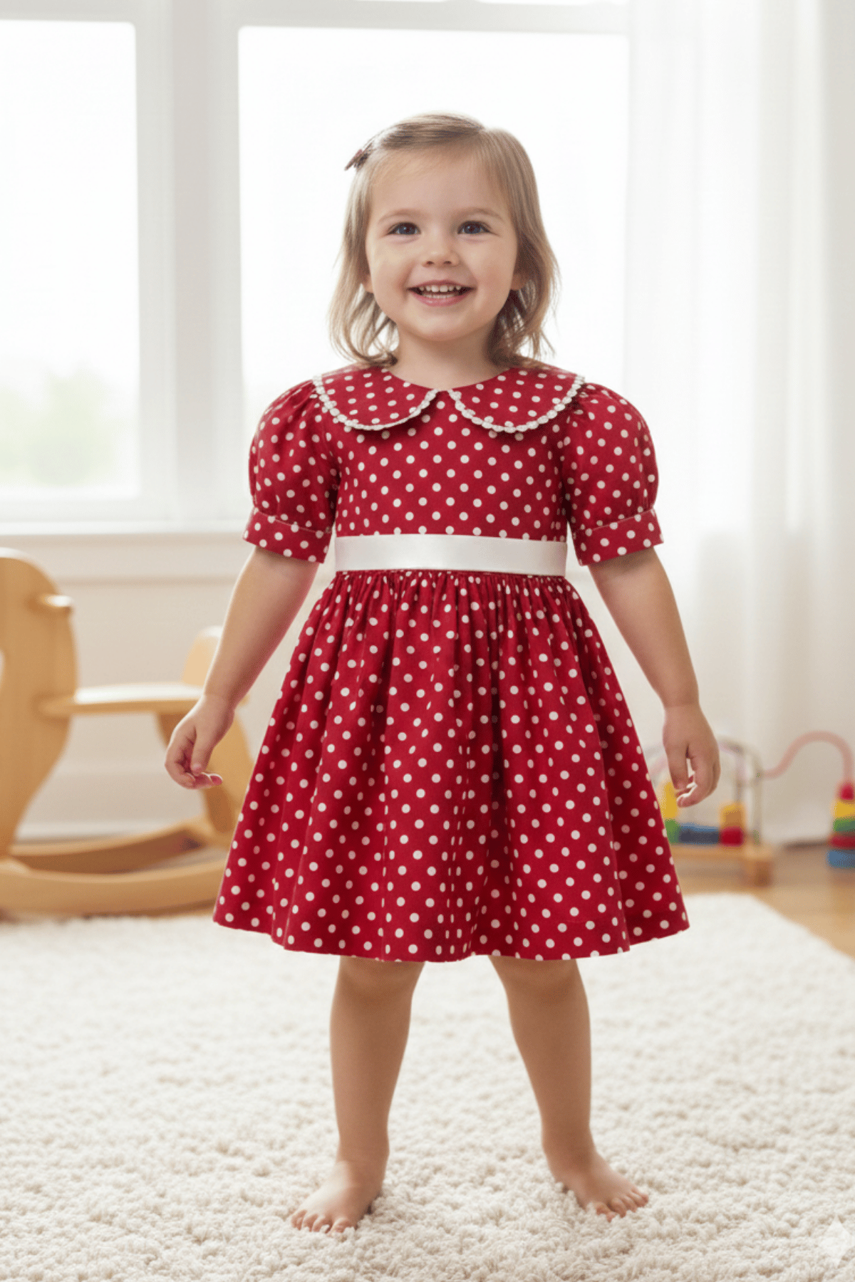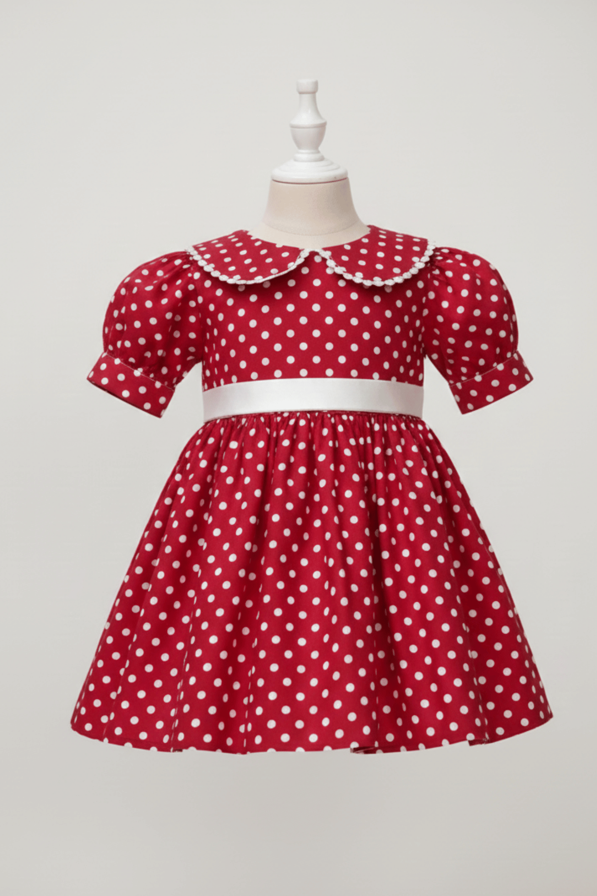 Unser Baumwollkleidmodell mit spitzenverziertem Babykragen, Satingürtel und Schleife sorgt dafür, dass Ihre Kleinen bei Konzeptshootings, Geburtstagen und besonderen Einladungen großartig aussehen.