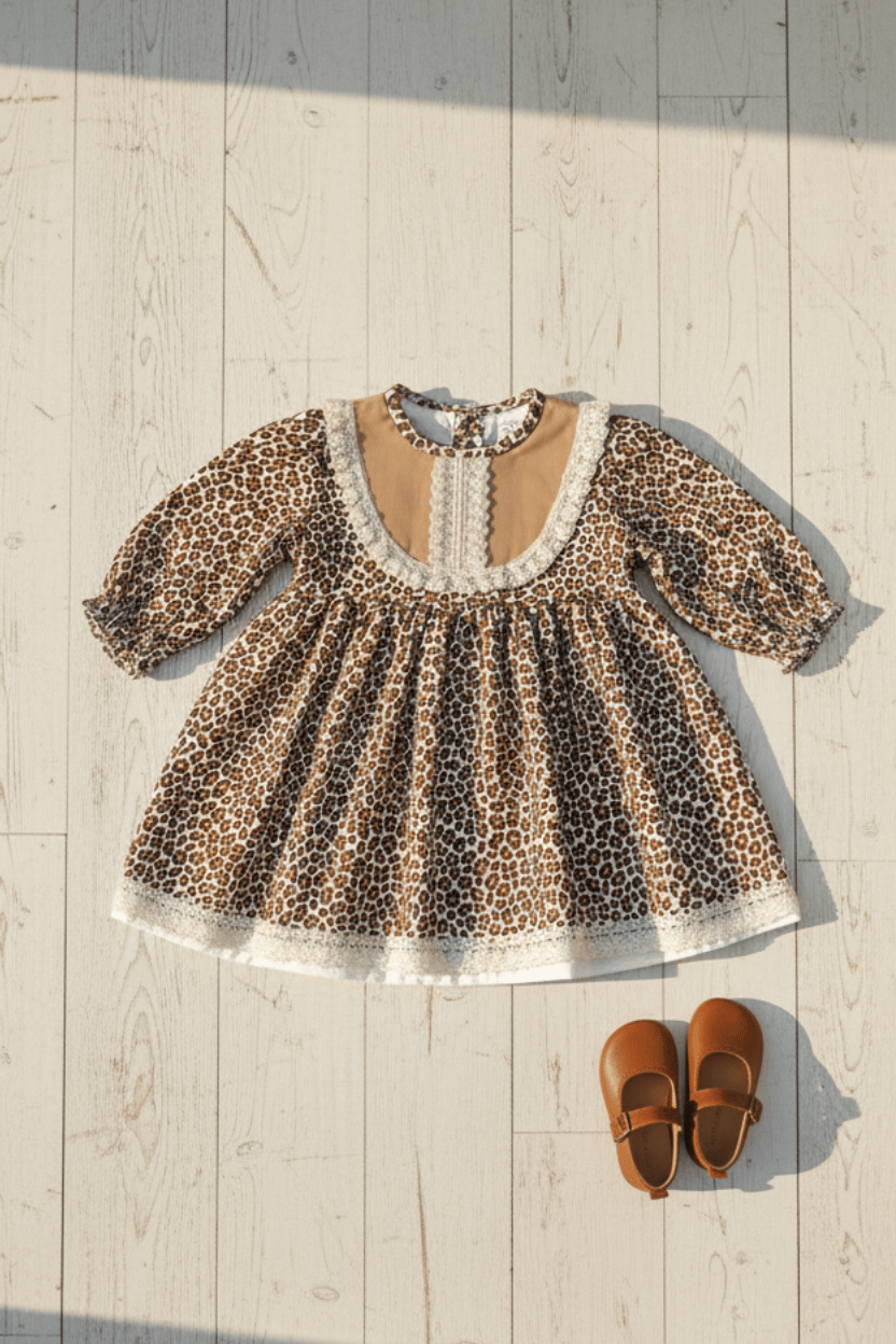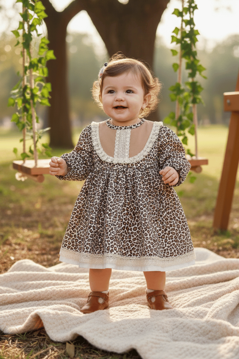 Dieses Kleid, das mit seinem Leopardenmuster die Aufmerksamkeit auf sich zieht, wird Ihren Kleinen sehr gut stehen