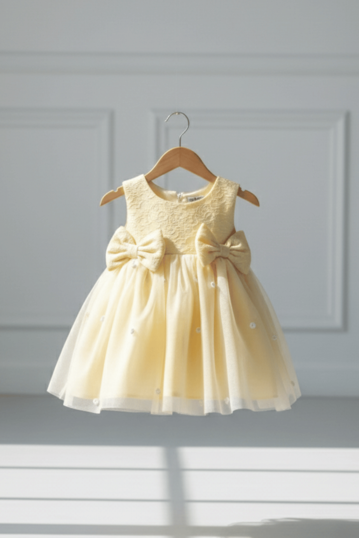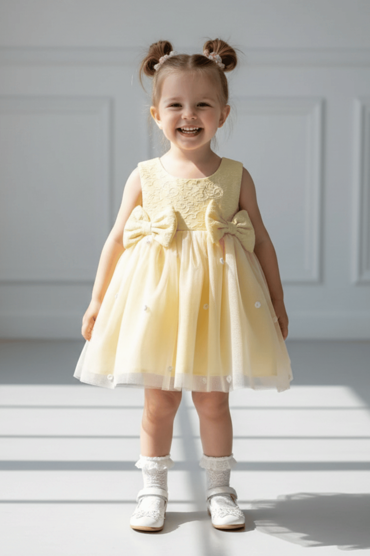 Sarı brokar kumaşı ve hayal tül detayıyla masalsı bir görünüm sunan bu abiye elbise, özel günlerde kızınızın parlamasını sağlar. Göğüs kısmındaki gül detayları ve beldeki gösterişli fiyonk tasarımı, elbiseye romantik ve şık bir dokunuş katar.