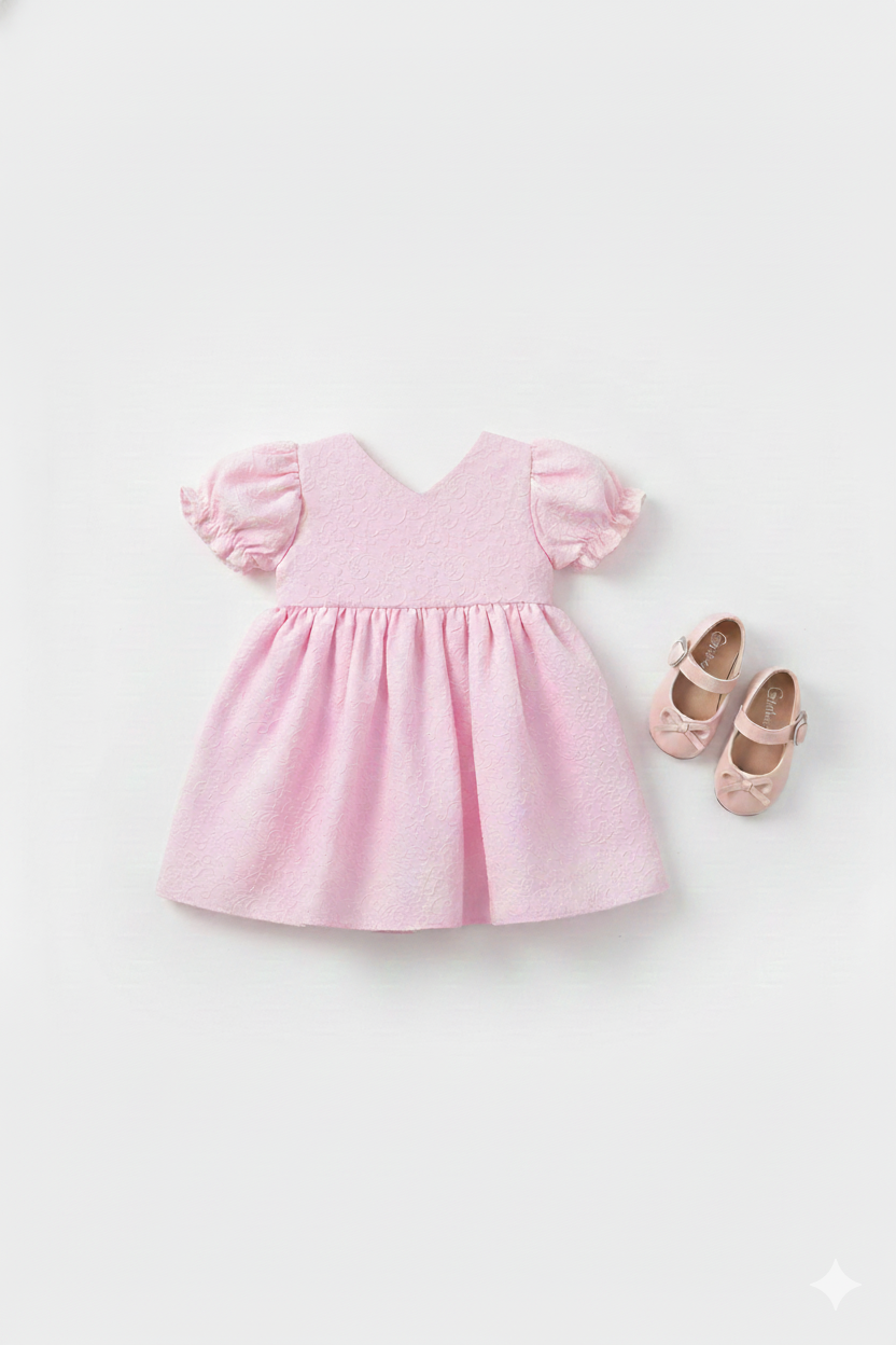 Unser Crêpe-Kleid mit herzförmigem Ausschnitt und Schleifenverzierung sieht mit seinem geprägten Zweigmuster sehr süß aus.
