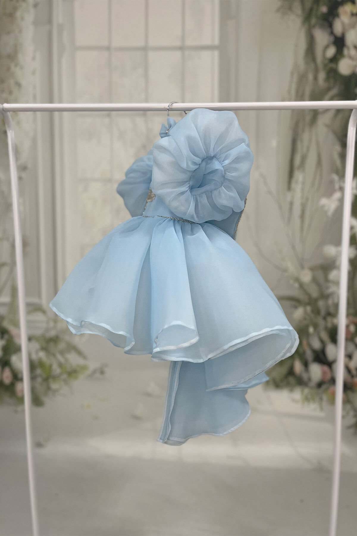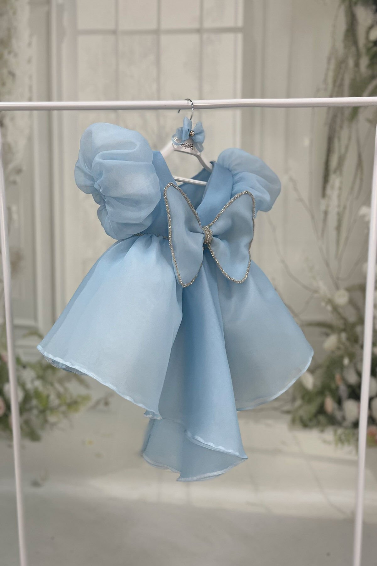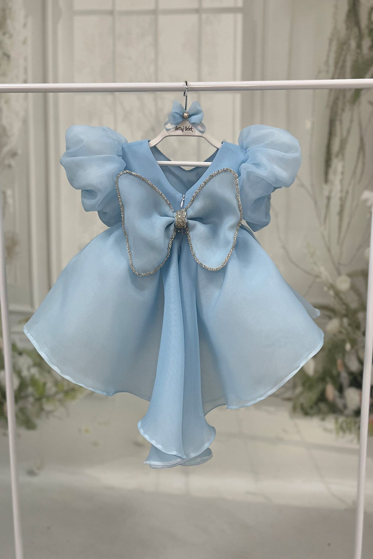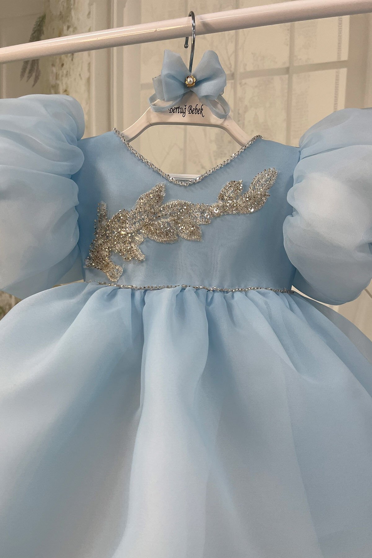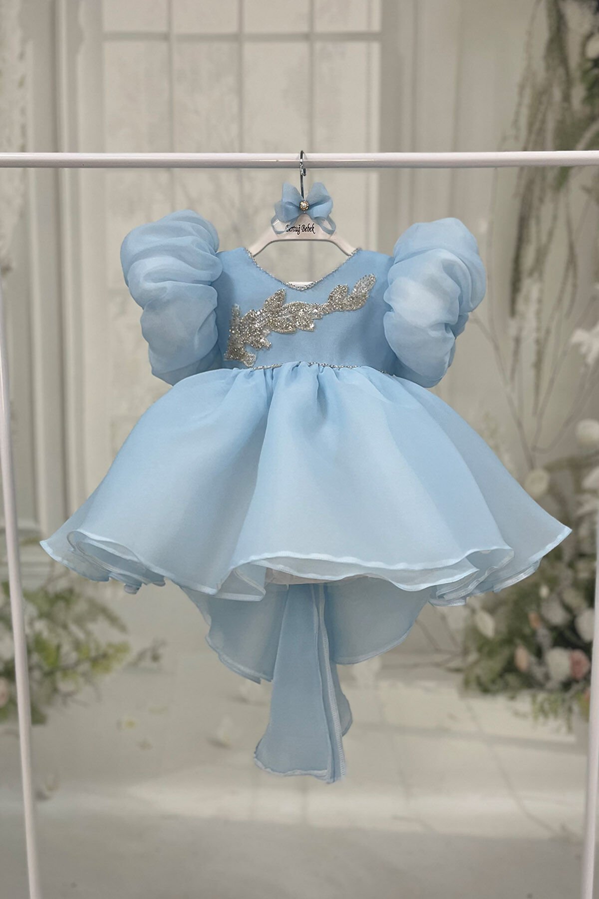 Bebe Mavi Balon Kol Nakış ve Boncuk İşlemeli Kuyruklu Fiyonk Detaylı Abiye Elbise