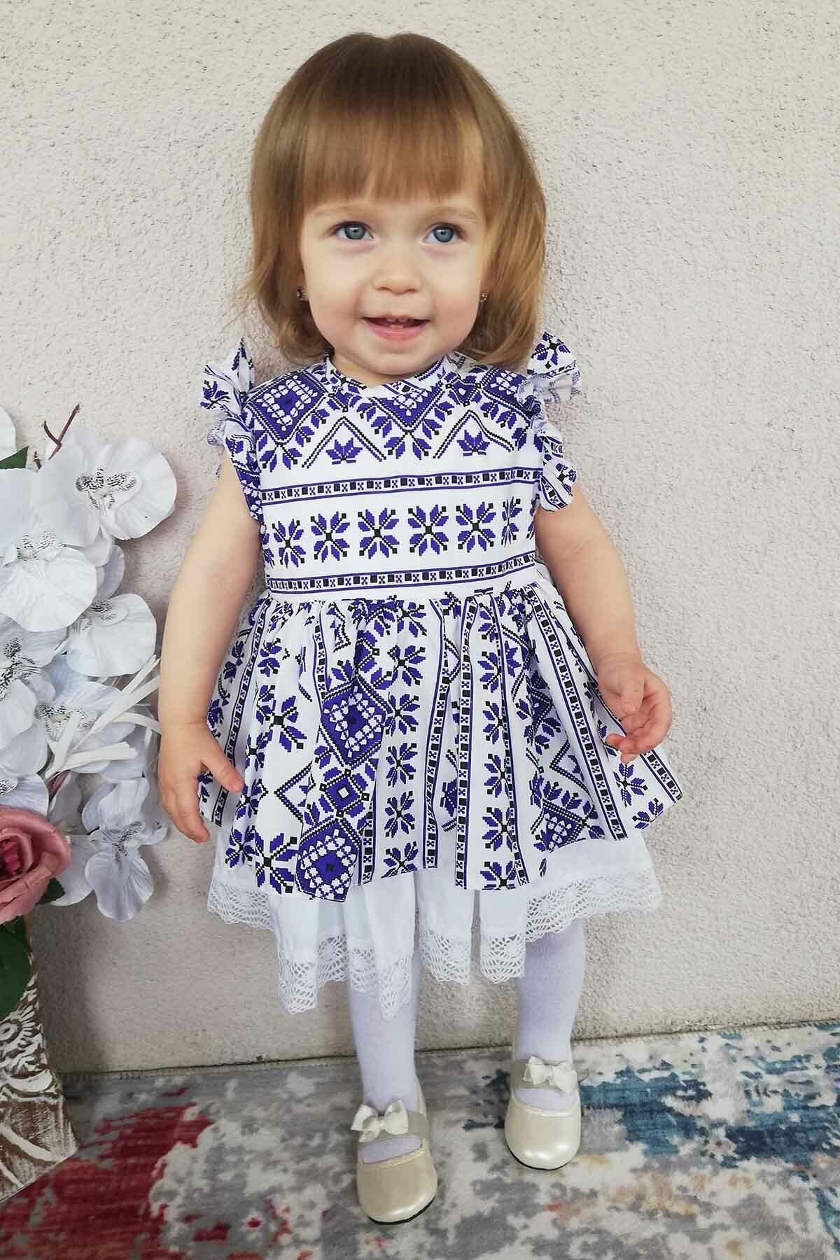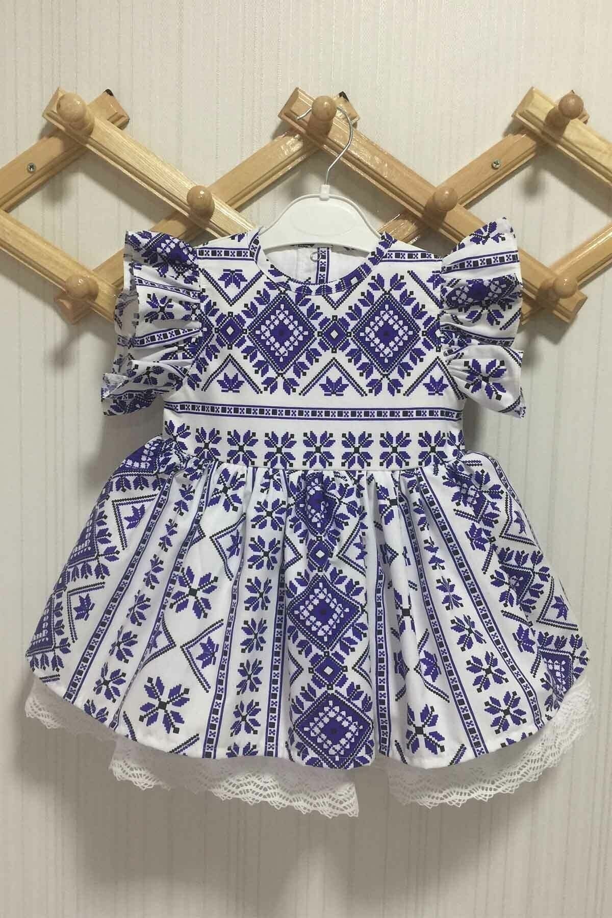 Fırfır Ve Dantel Detaylı Etnik Desenli Mavi Beyaz Kız Çocuk Bebek Elbise