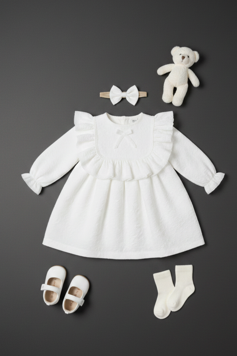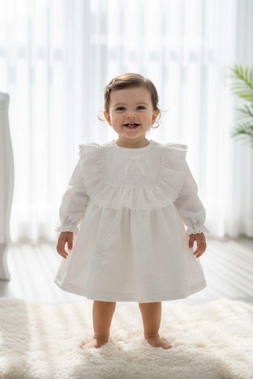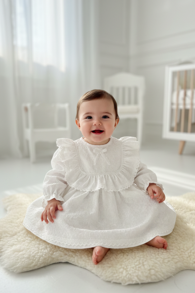 Zarafetin en masum hali! Özel günlerde ve bayramlarda minik prensesinizin şıklığını tamamlayacak bu elbise, klasik detayları modern konforla birleştiriyor.