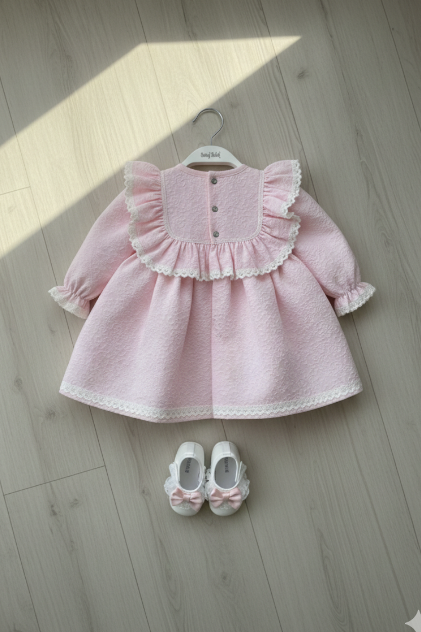Vintage Esintili Pembe Kabartma Dokulu Kız Çocuk Bebek Elbisesi