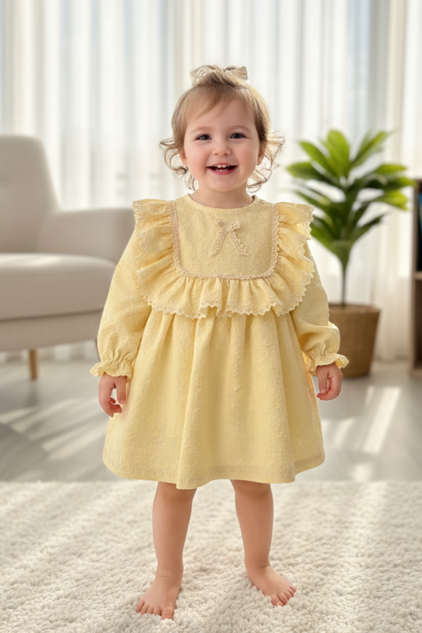 Dantelli ve Fırfırlı Kabartmalı Krep Sarı Kız Çocuk Bebek Elbise Dantelli ve Fırfırlı Kabartmalı Krep Sarı Kız Çocuk Bebek Elbise 595