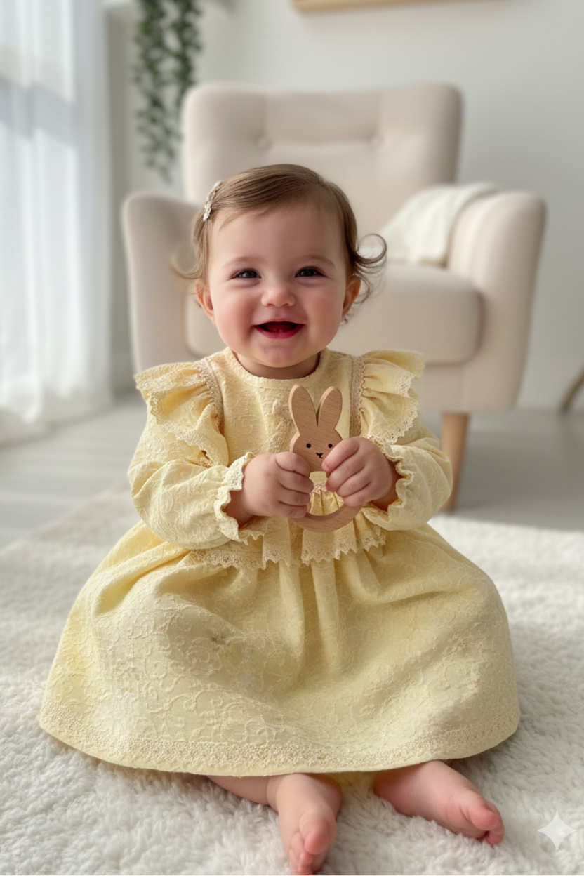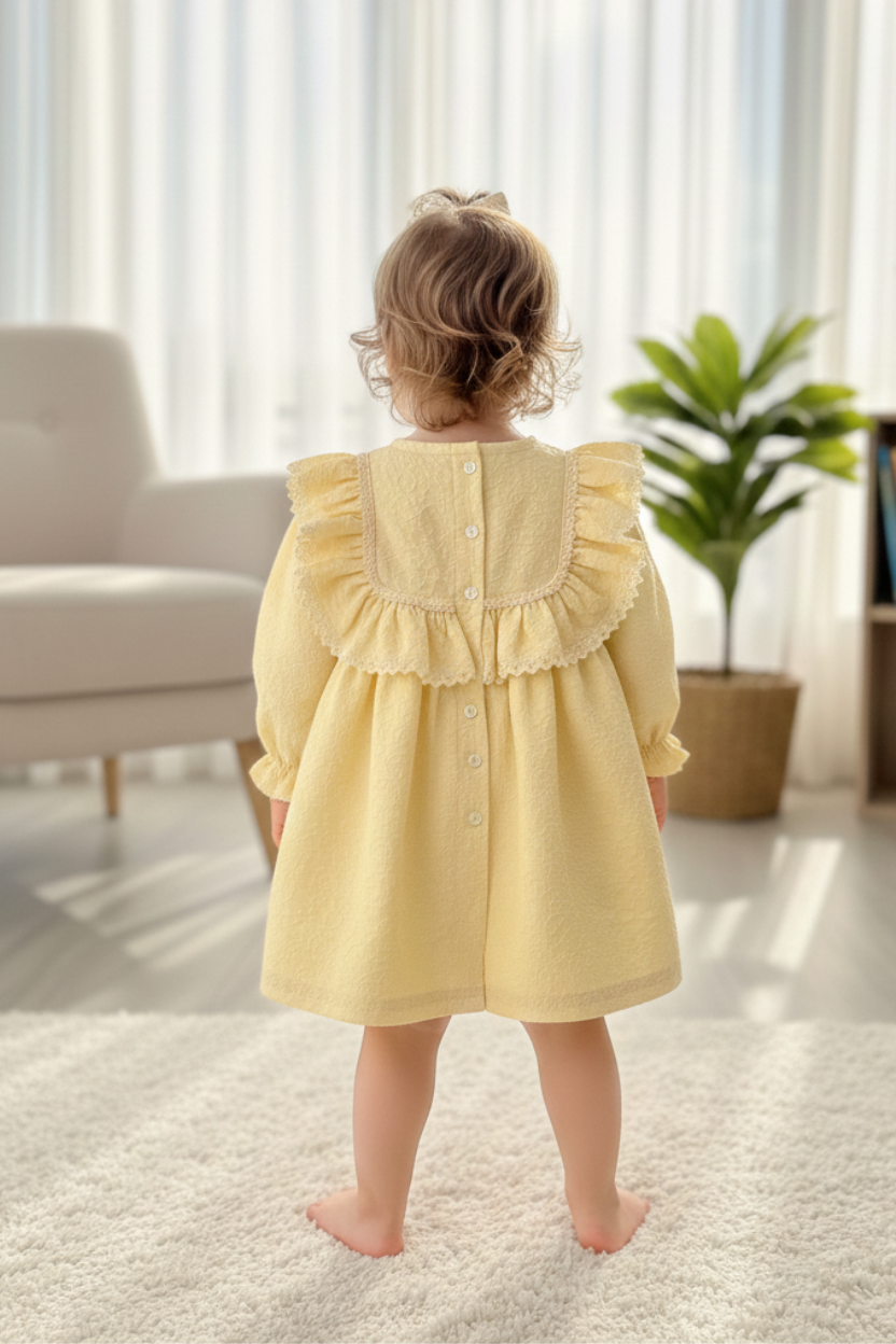 Dantelli ve Fırfırlı Kabartmalı Krep Sarı Kız Çocuk Bebek Elbise