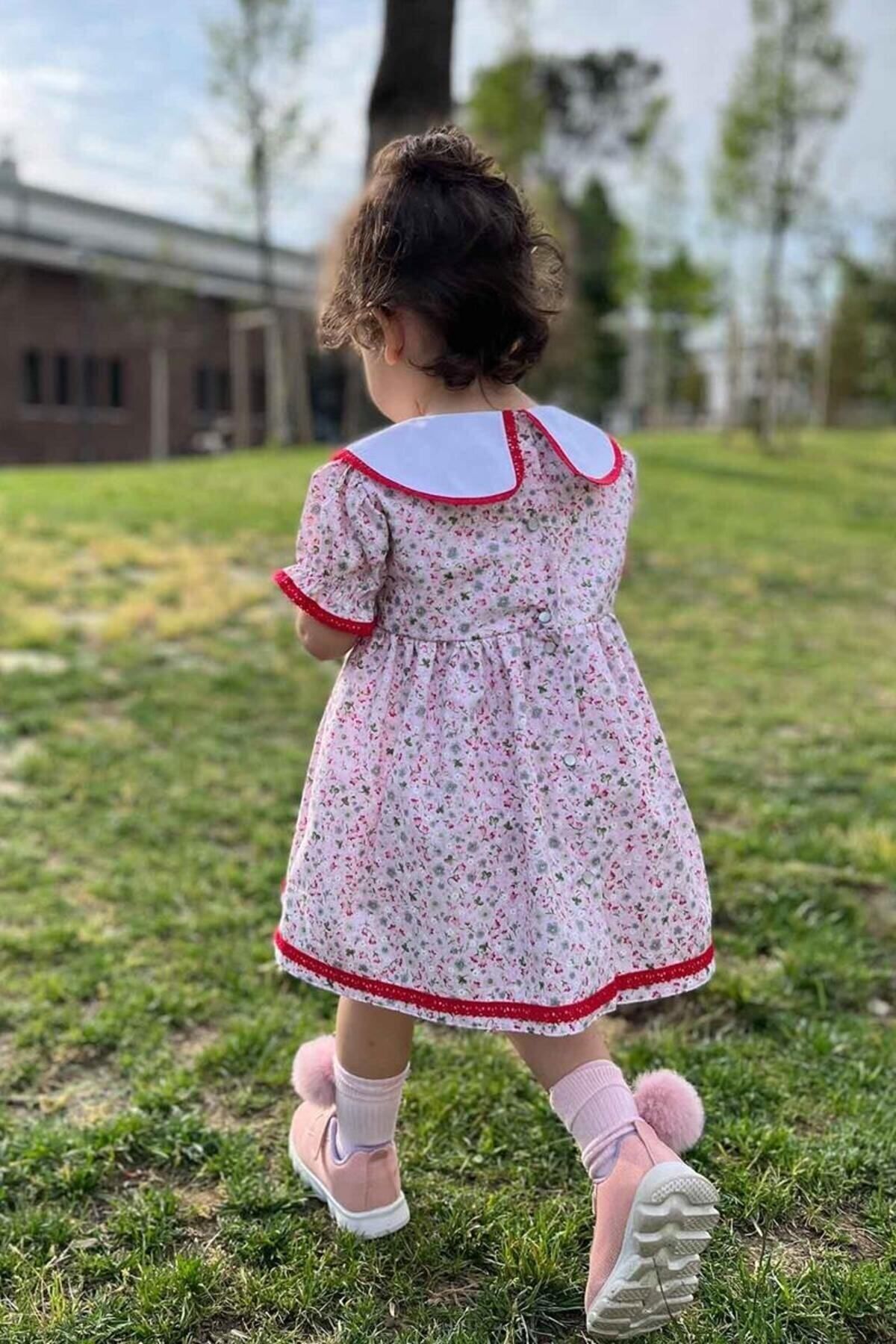 Our red cotton lace-trimmed floral dress is a model that parents can use with peace of mind thanks to its collar decoration and organic fabric content.