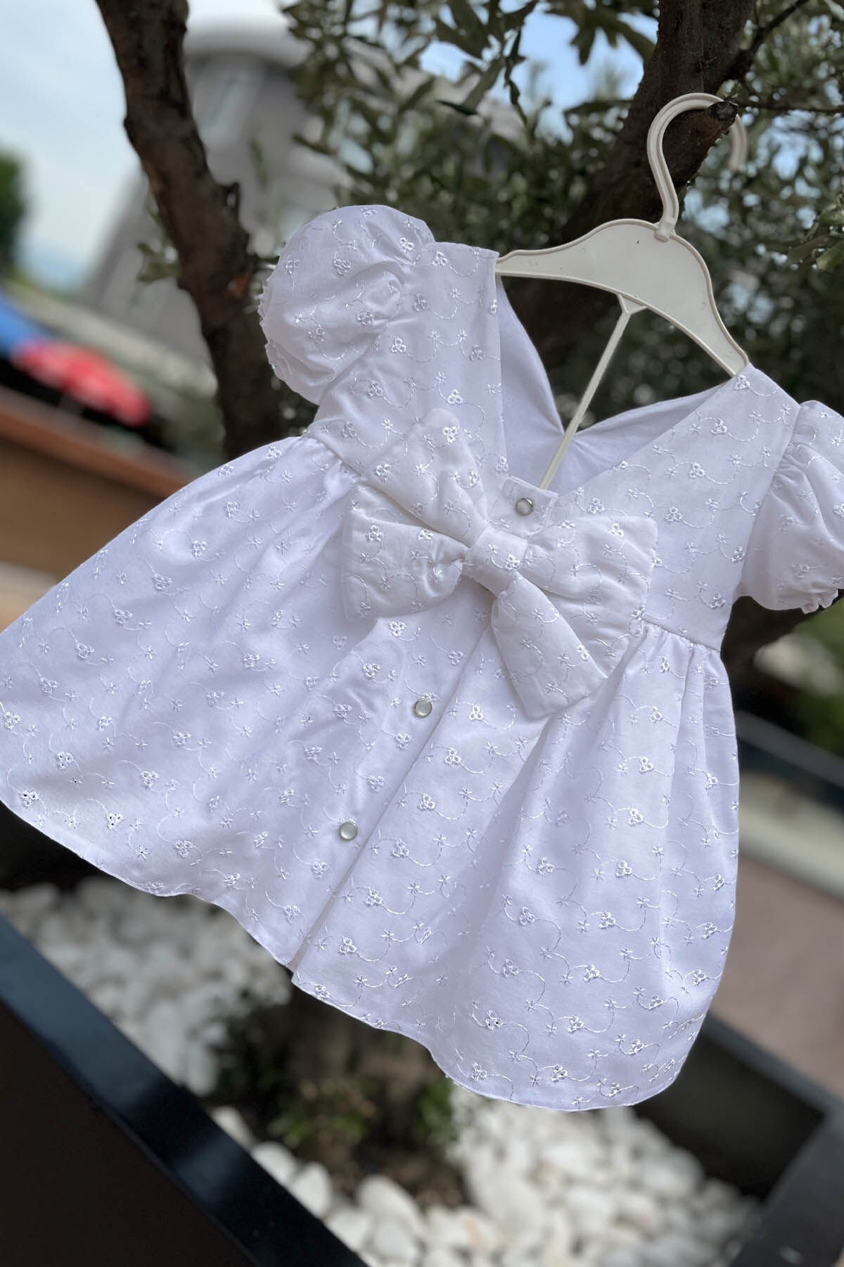 Our 100% cotton model with its tiny, crispy flower pattern and back bow is a very sweet mawlid, birthday dress.