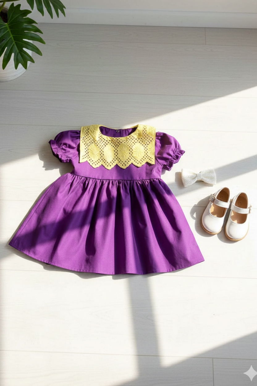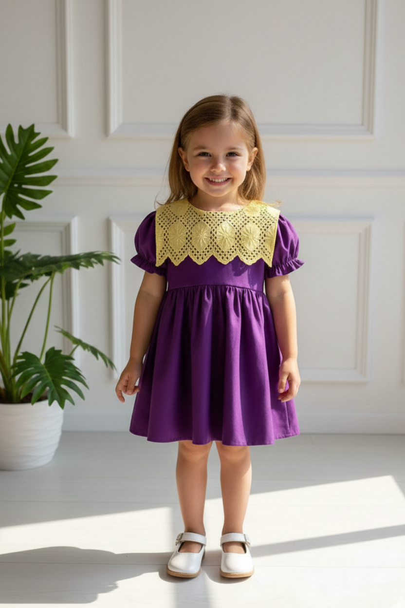 Our very cute dress with its laser-cut patterned yellow guipure collar is made of 100% cotton fabric.