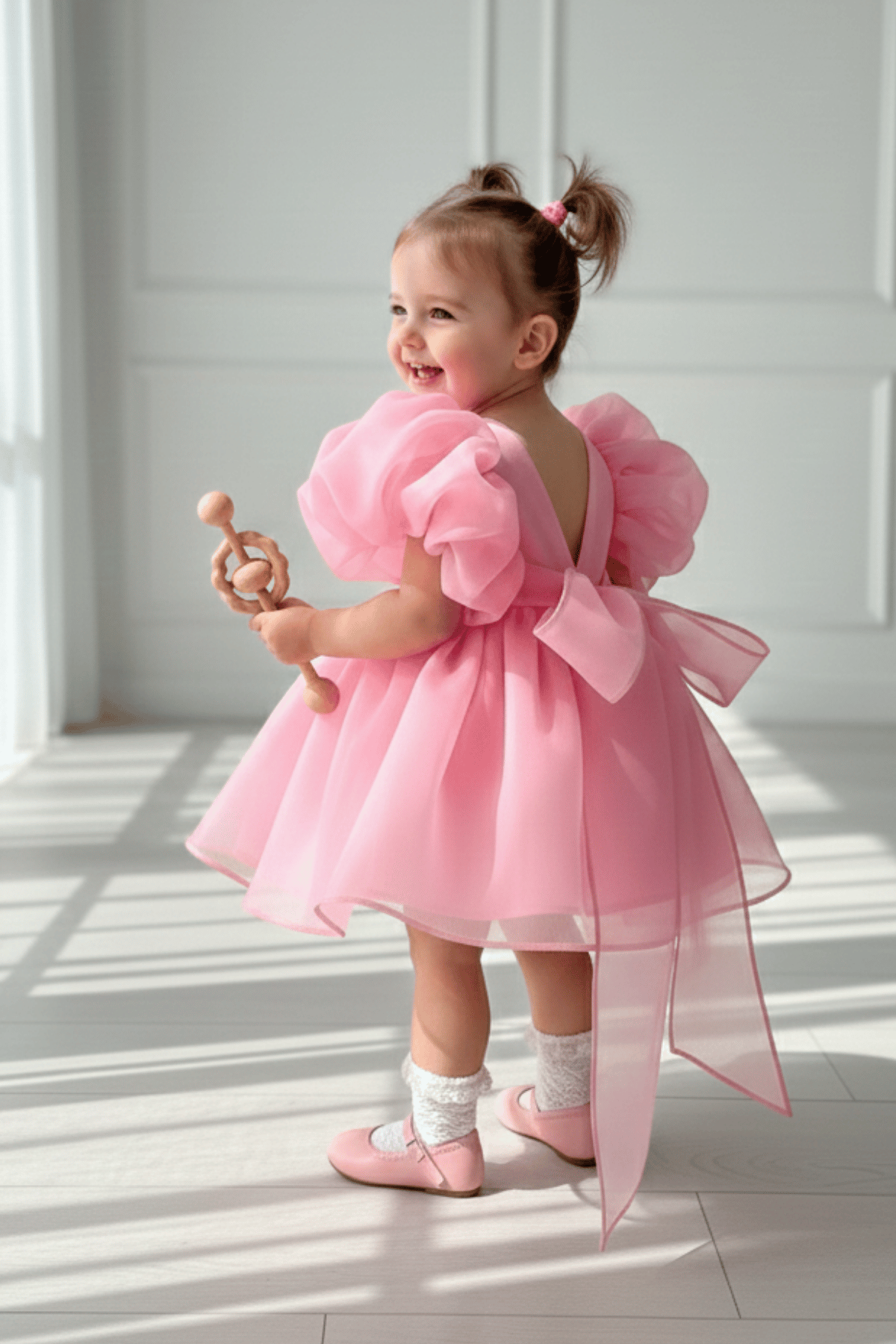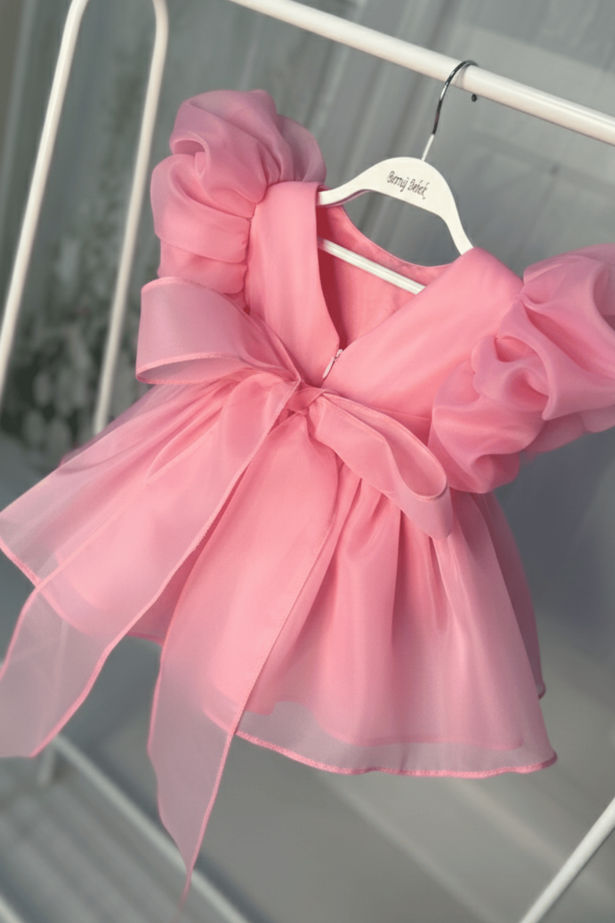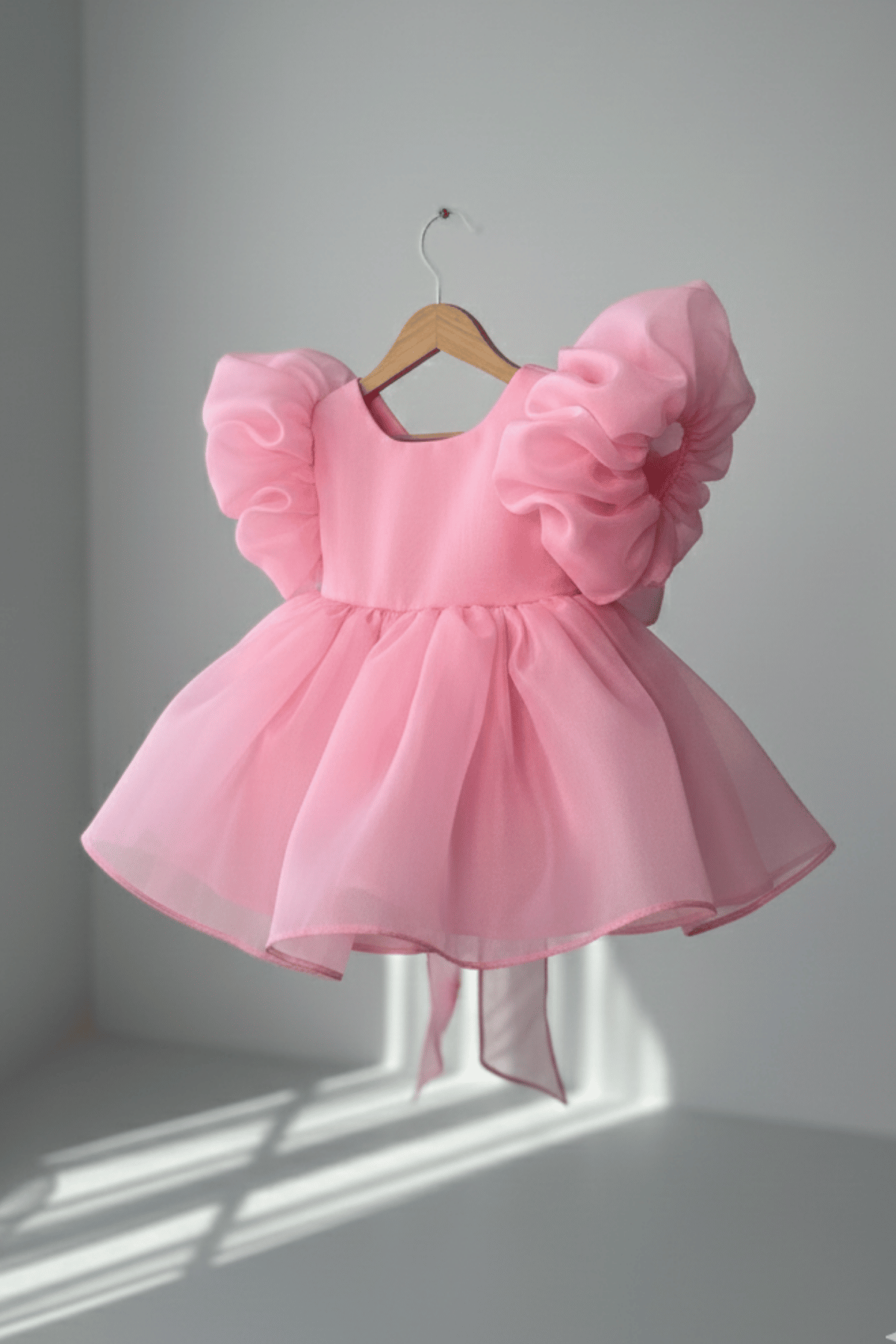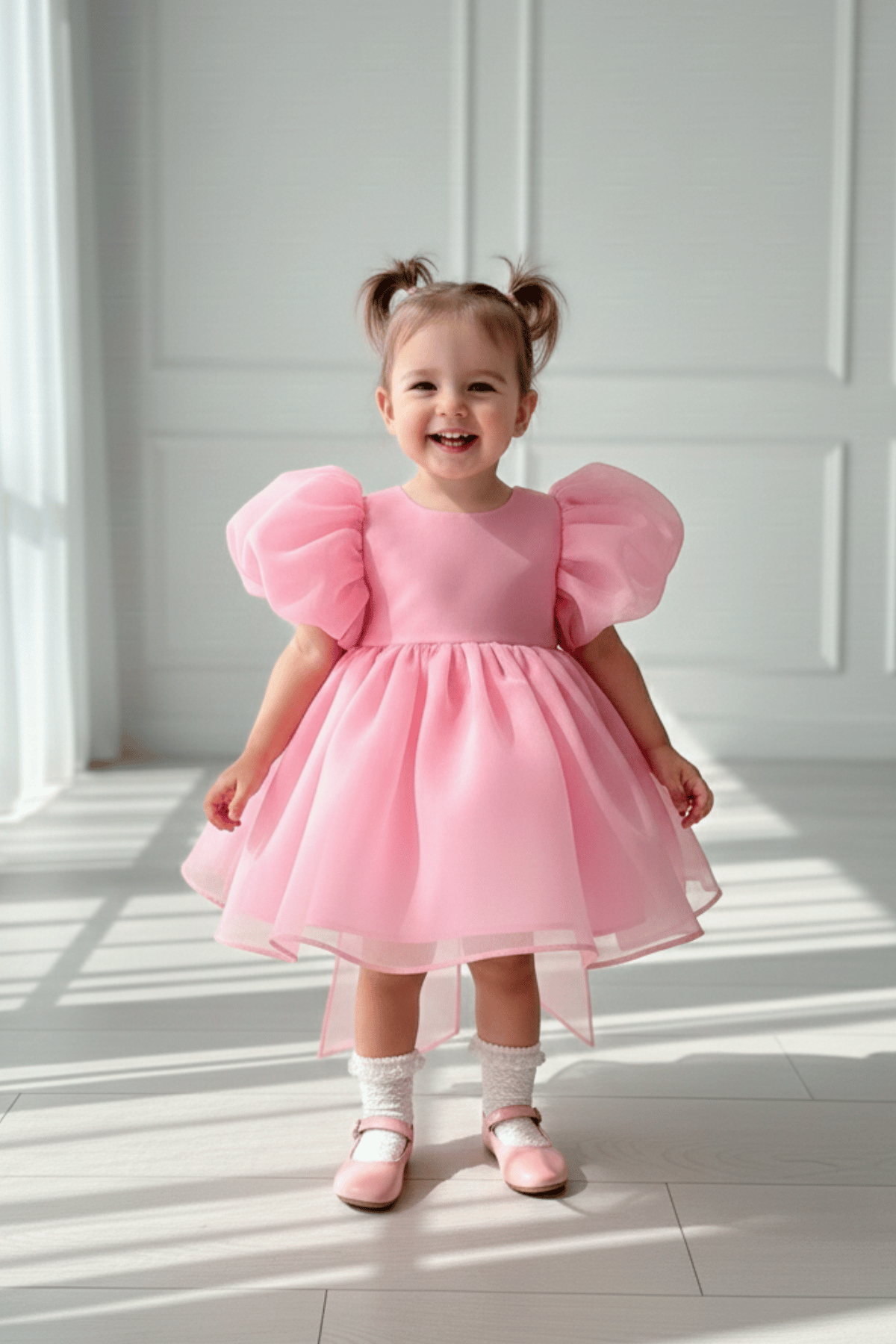 Karolin Balon Kol Şeker Pembe Pamuk Astarlı Kız Bebek Çocuk Romper Külotlu Abiye Elbise