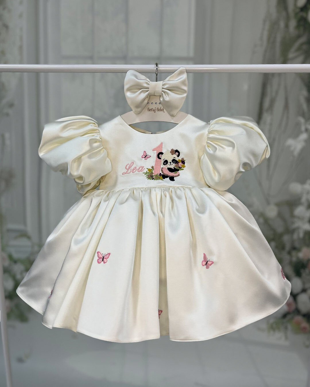 Özel günler için tasarlanmış bu zarif ekru renkli bebek abiyesi, kaliteli saten kumaşı ve şık balon kollarıyla göz alıyor. Göğüs kısmında sevimli panda figürü ve kelebek detayları yer almakta olup, isteğe göre bebeğinizin ismi ve yaşına özel nakış işlemesi yapılmaktadır.
