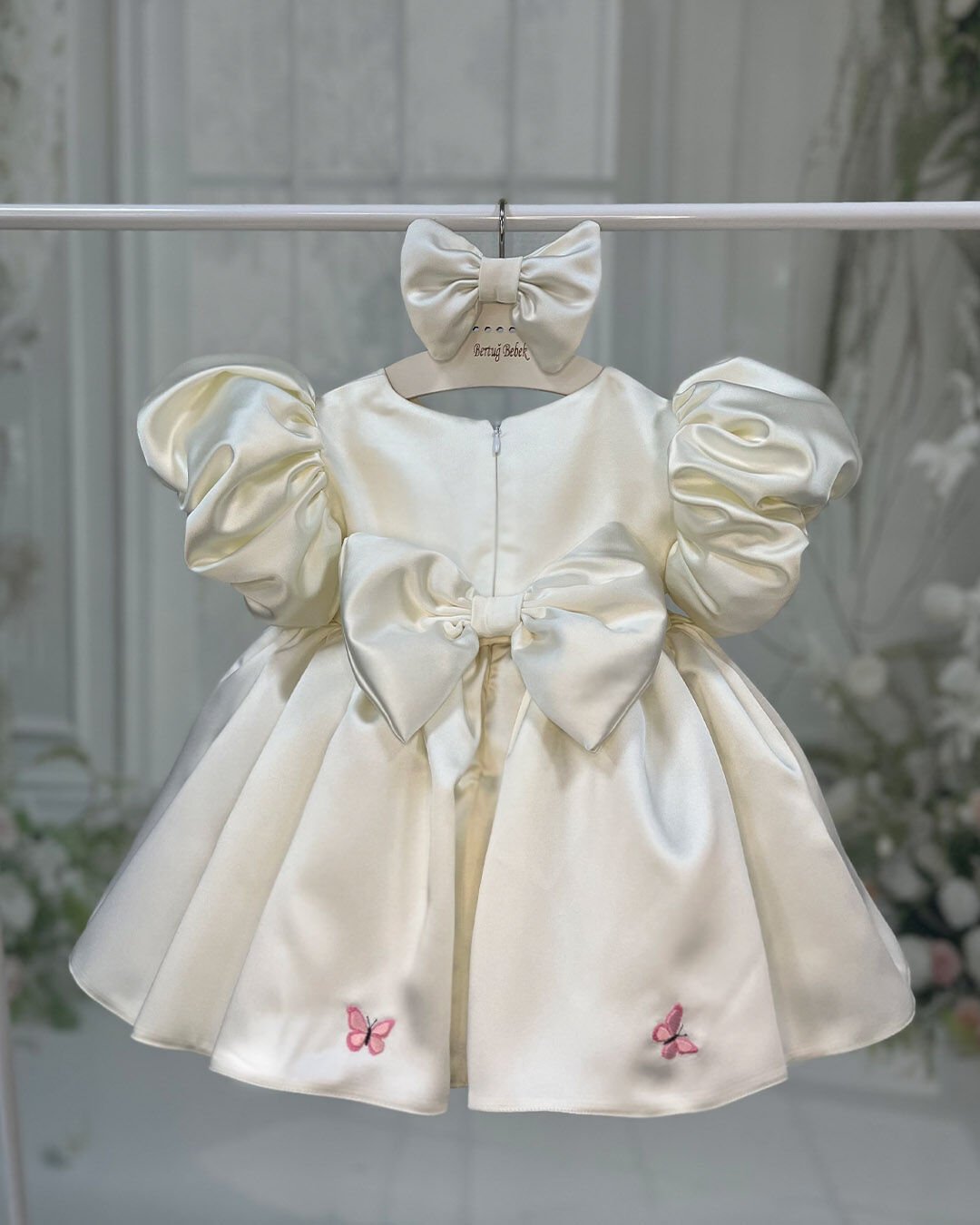 Balon Kol Ekru Kız Bebek Saten Abiye - Kişiye Özel İsimli, Nakış İşlemeli