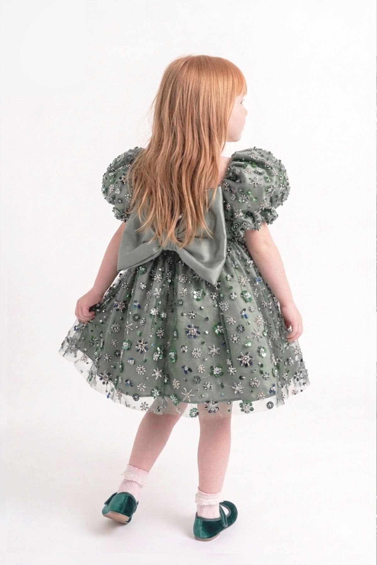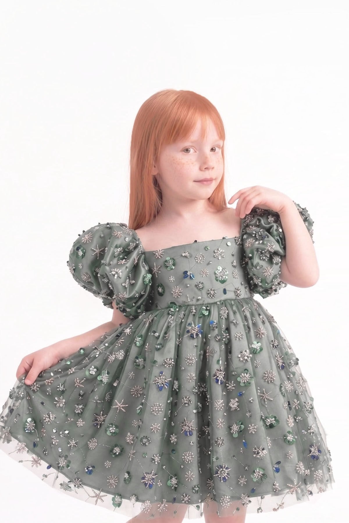 Boncuk işlemeli dantelli tüllü kız çocuk elbisesi, zarif ve dikkat çekici tasarımıyla özel günler için ideal bir seçimdir. Üzeri özenle işlenmiş boncuk detayları ve dantel dokusu elbiseye şık bir görünüm kazandırır.