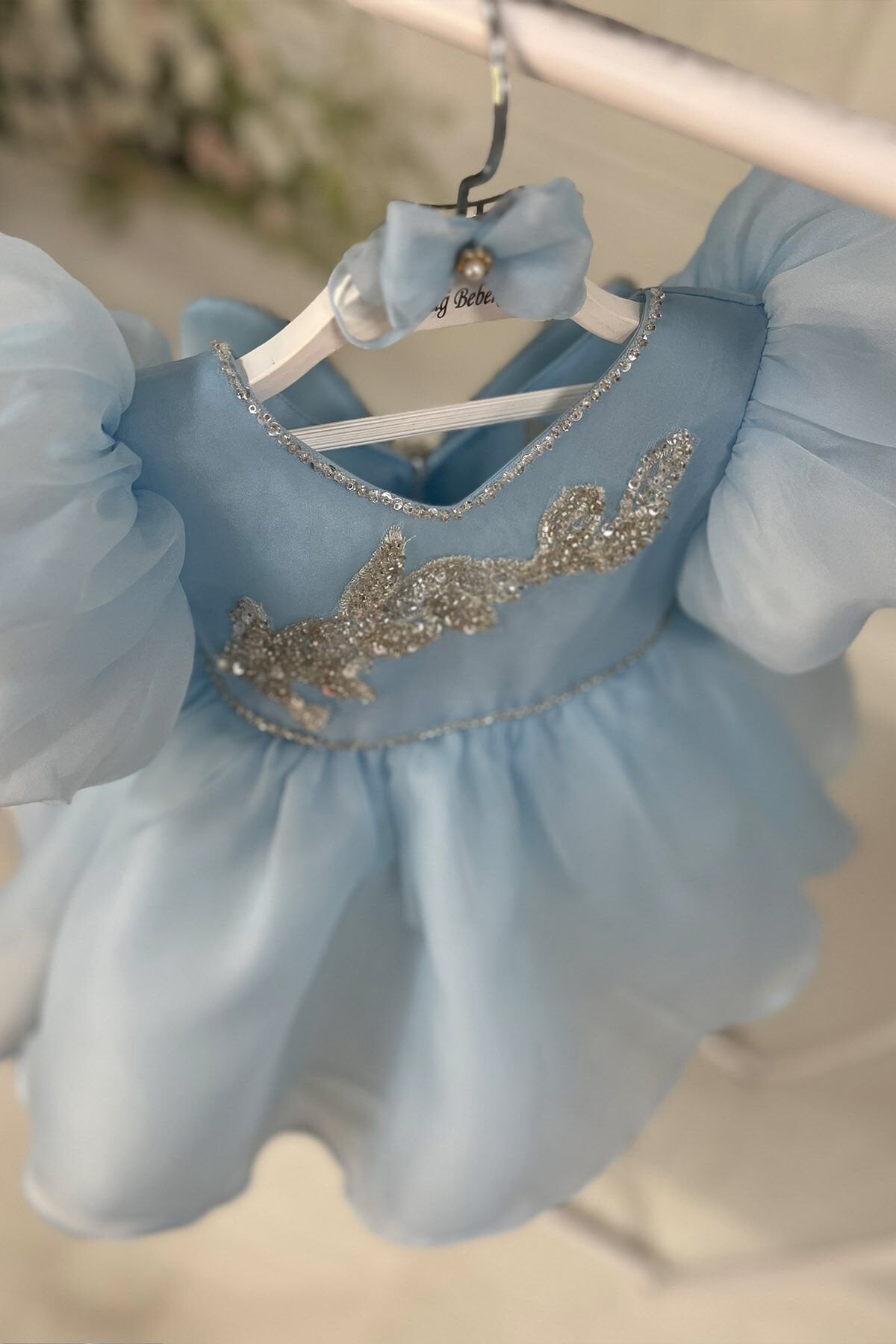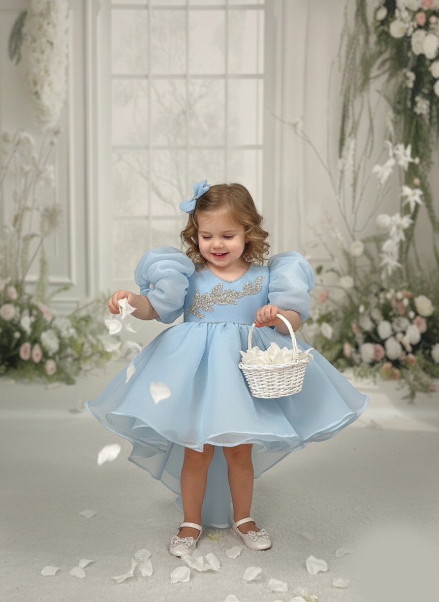 Bebe Mavi Balon Kol Nakış ve Boncuk İşlemeli Kuyruklu Fiyonk Detaylı Abiye Elbise