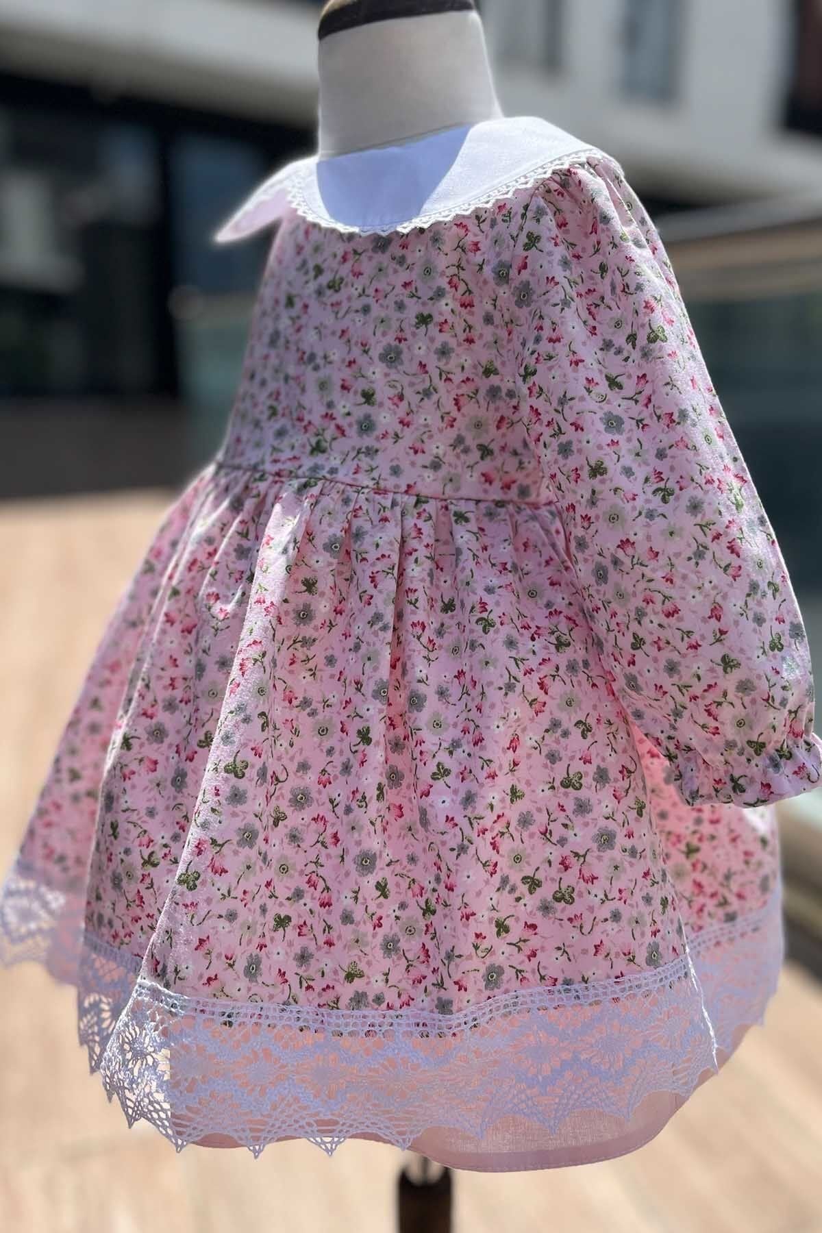 Minik çıtır çiçek deseni ve dantel süslemeleri ile çok tatlı olan bu elbisemiz istediğiniz renk kombinasyonunda üretilmektedir