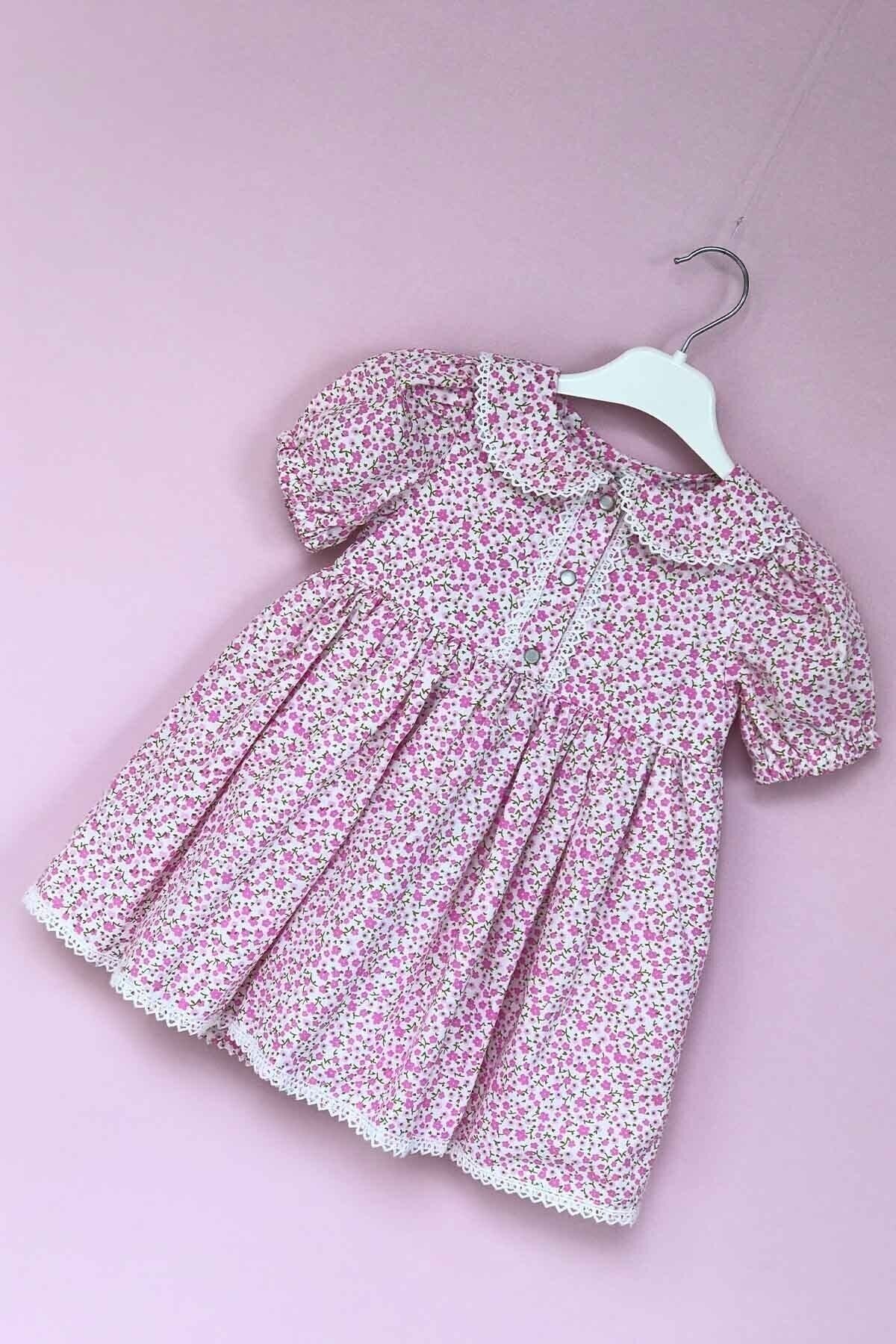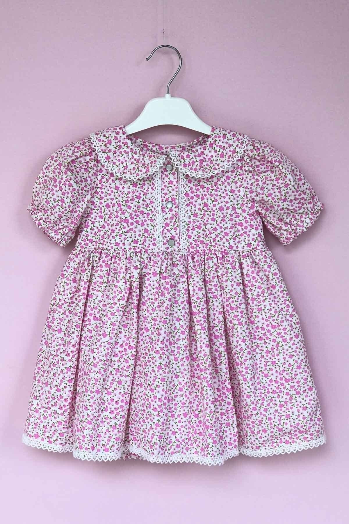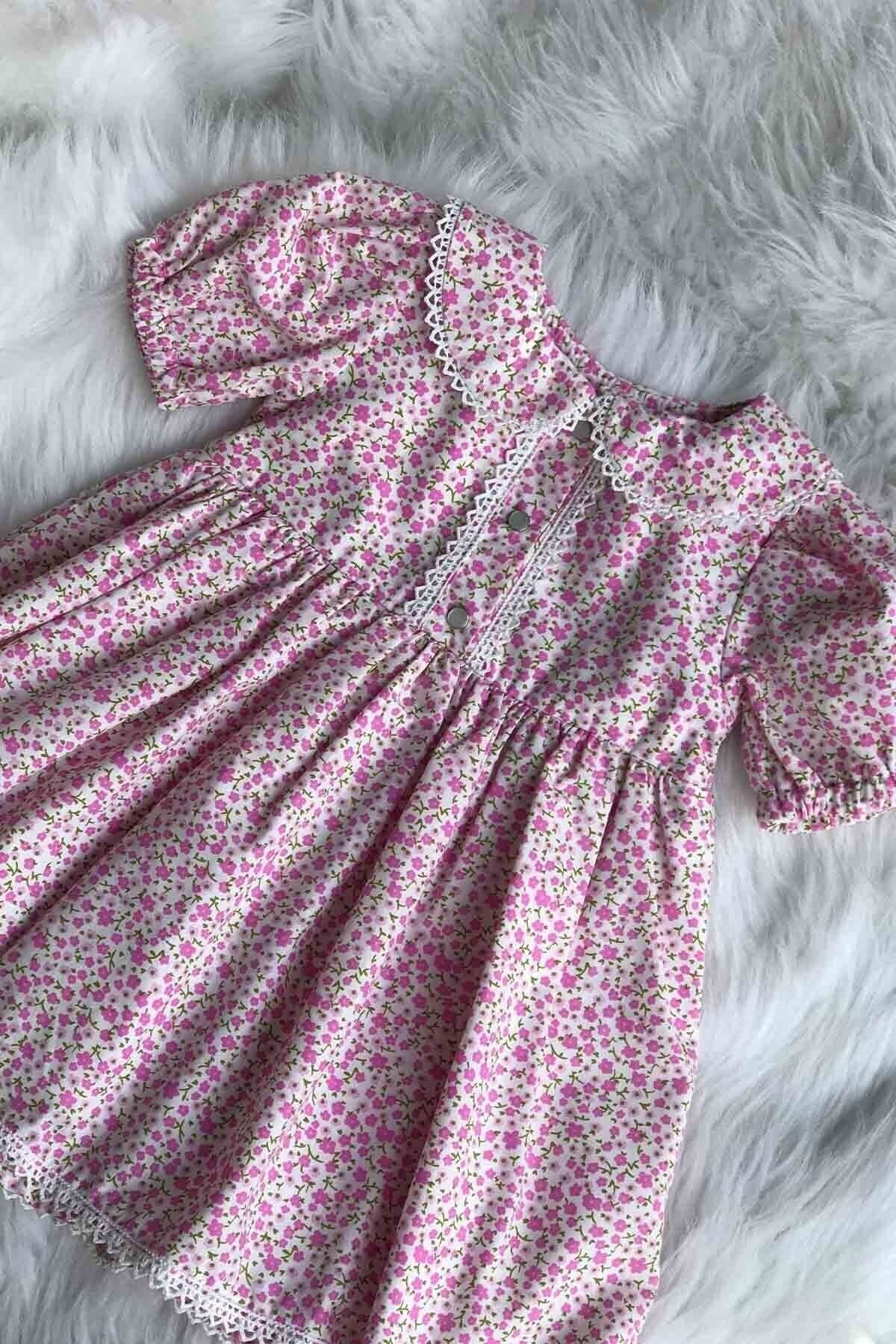 Dantelli Pamuklu Pembe Çiçekli Ön Pat Çıt Çıtlı Kız Çocuk Elbise