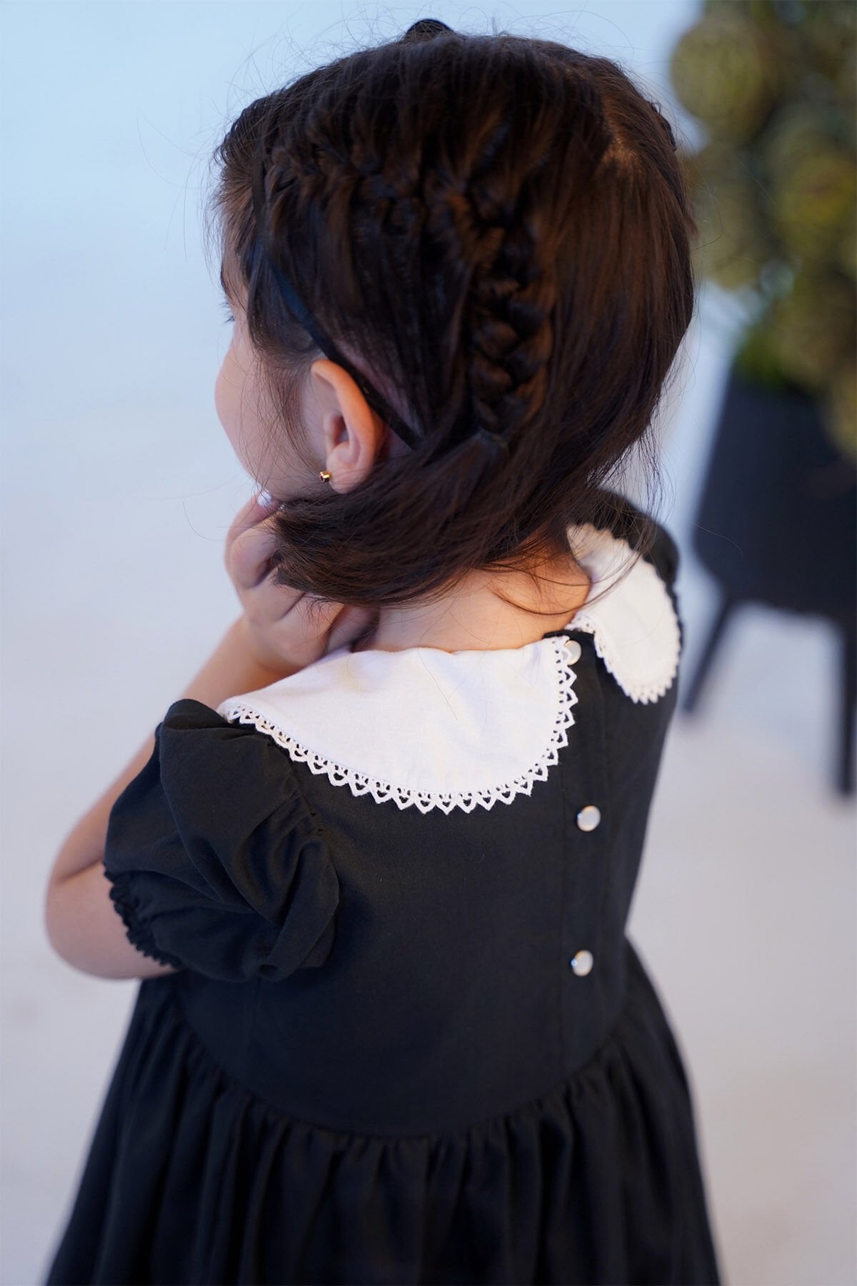 Hem şık hem rahat! Yüksek kaliteli poplin kumaştan üretilen bu kısa kollu elbise, kontrast beyaz bebe yakasıyla dikkat çekiyor.
