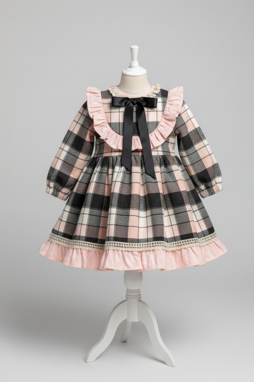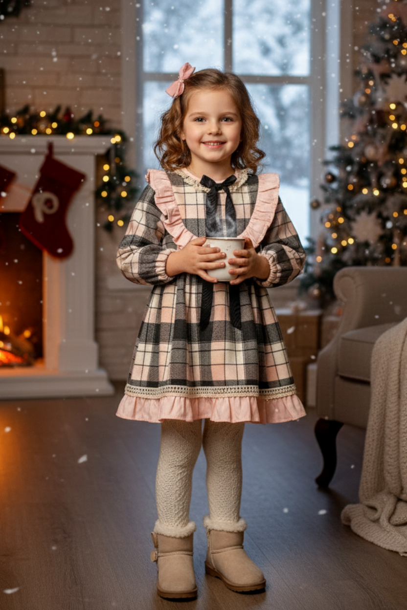 Kış aylarının vazgeçilmezi ekose desenini, zarif dantel süslemelerle buluşturduk! Minik prensesler için hem sıcak tutan hem de göz alıcı bir şıklık sunan bu elbise, özel günlerden günlük kullanıma kadar her an için ideal.