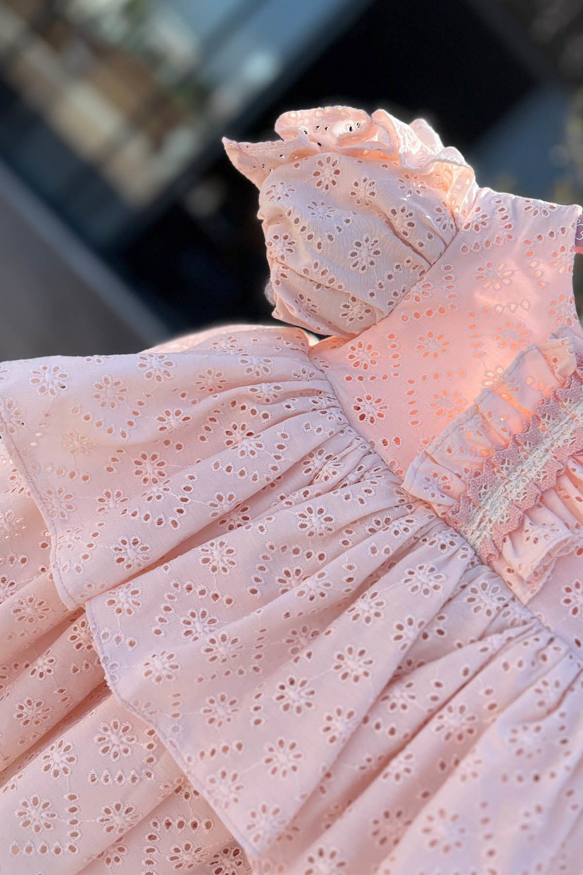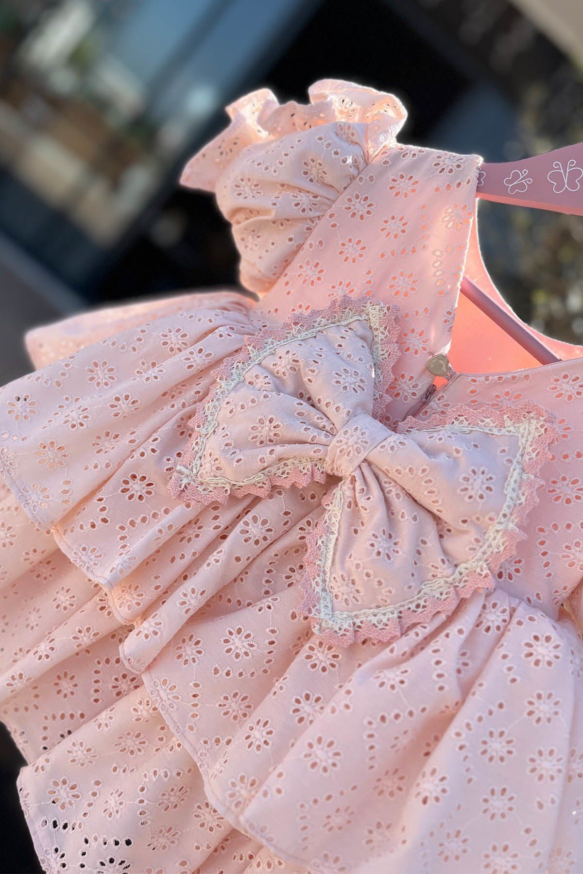 Dantel ve Büzgü Süslemeli Kız Çocuk Bebek Fisto Pamuk Abiye Pudra Pembe Somon Elbise