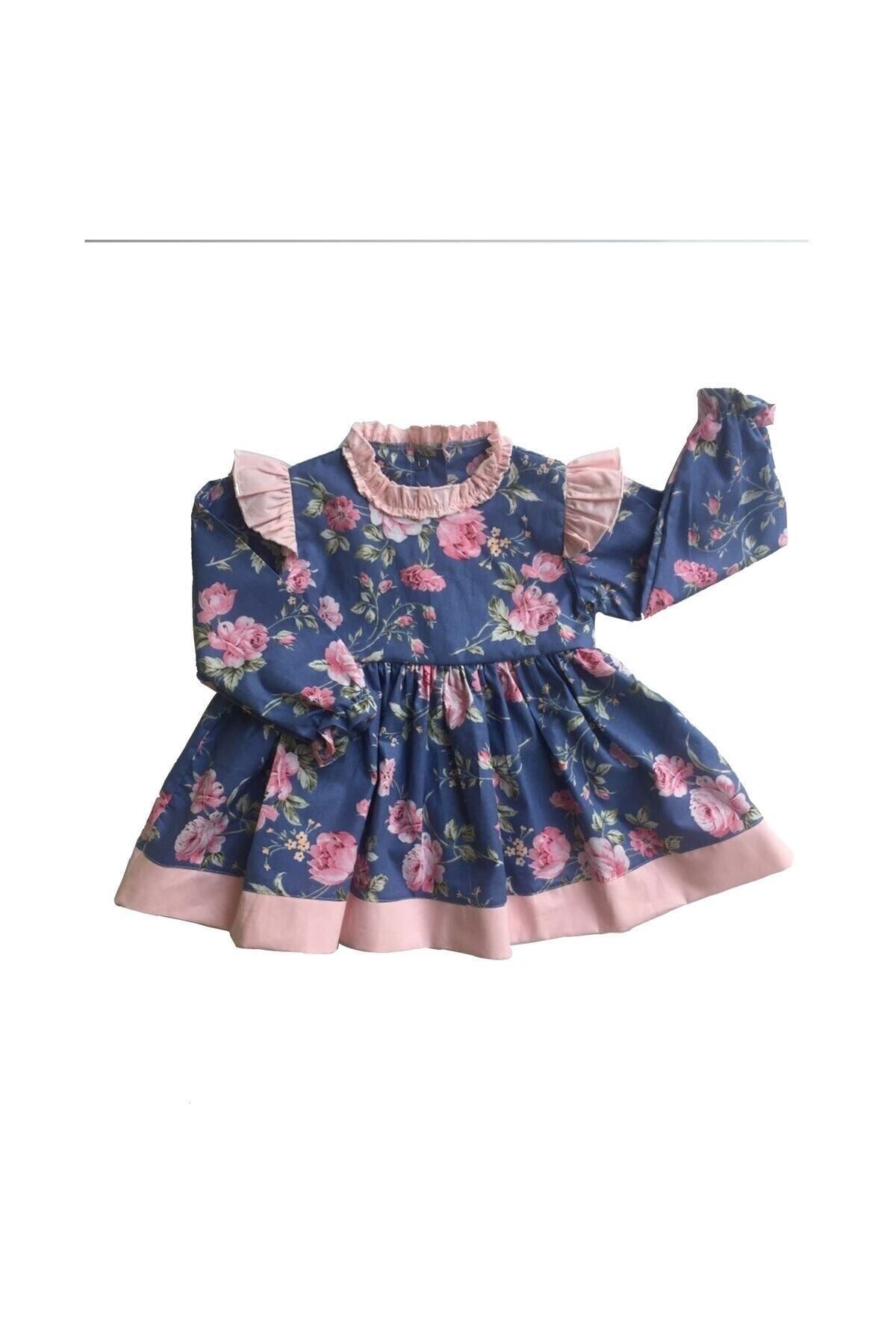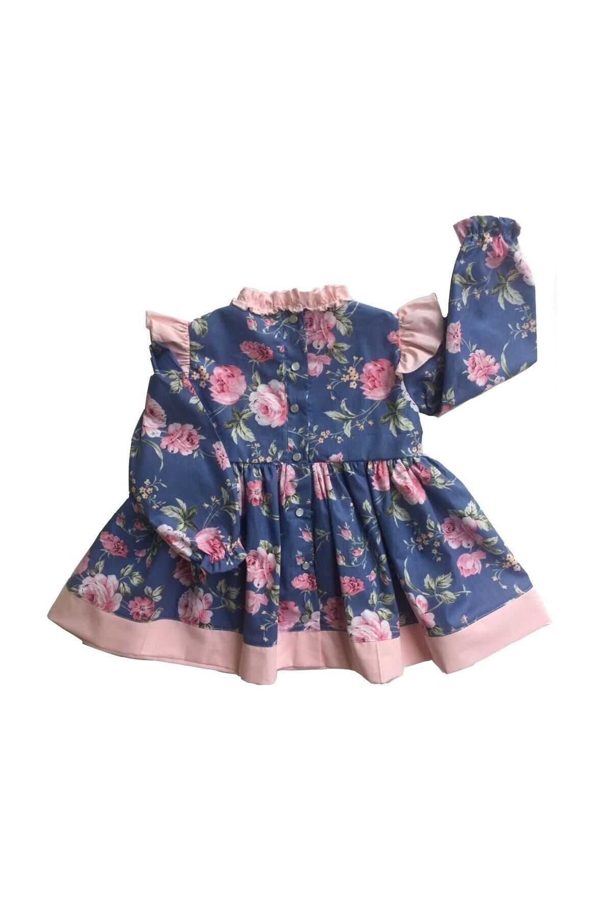 Pembe fırfır ve etek süslemesi ile mavi gül desenli elbisemiz %100 pamuklu kumaştan üretilmektedir.