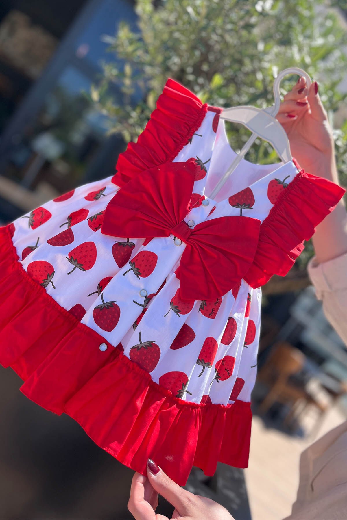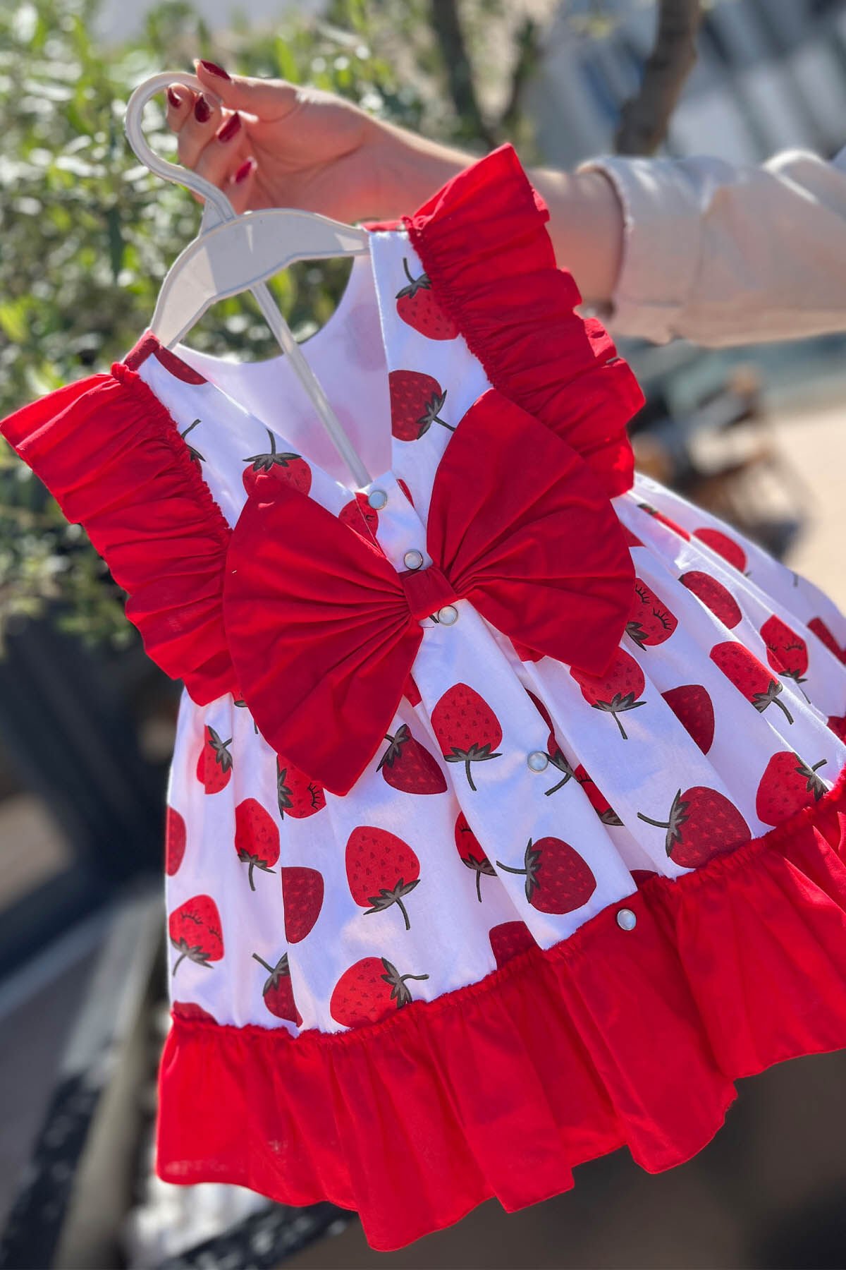 %100 pamuklu kumaştan üretilmiştir, dikkat çekici çilek desenleriyle tasarlanmıştır. Etek ucu ve gövdesindeki fırfır detayları ile hareket kazanan elbise, bel kısmında yer alan şık fiyonkla tamamlanmıştır. İç kısmı astarlıdır ve çıt çıt kapama sistemi sayesinde kolay giyilip çıkarılabilir. Hem şık hem de konforlu yapısıyla yaz aylarında çocuklar için idealdir.