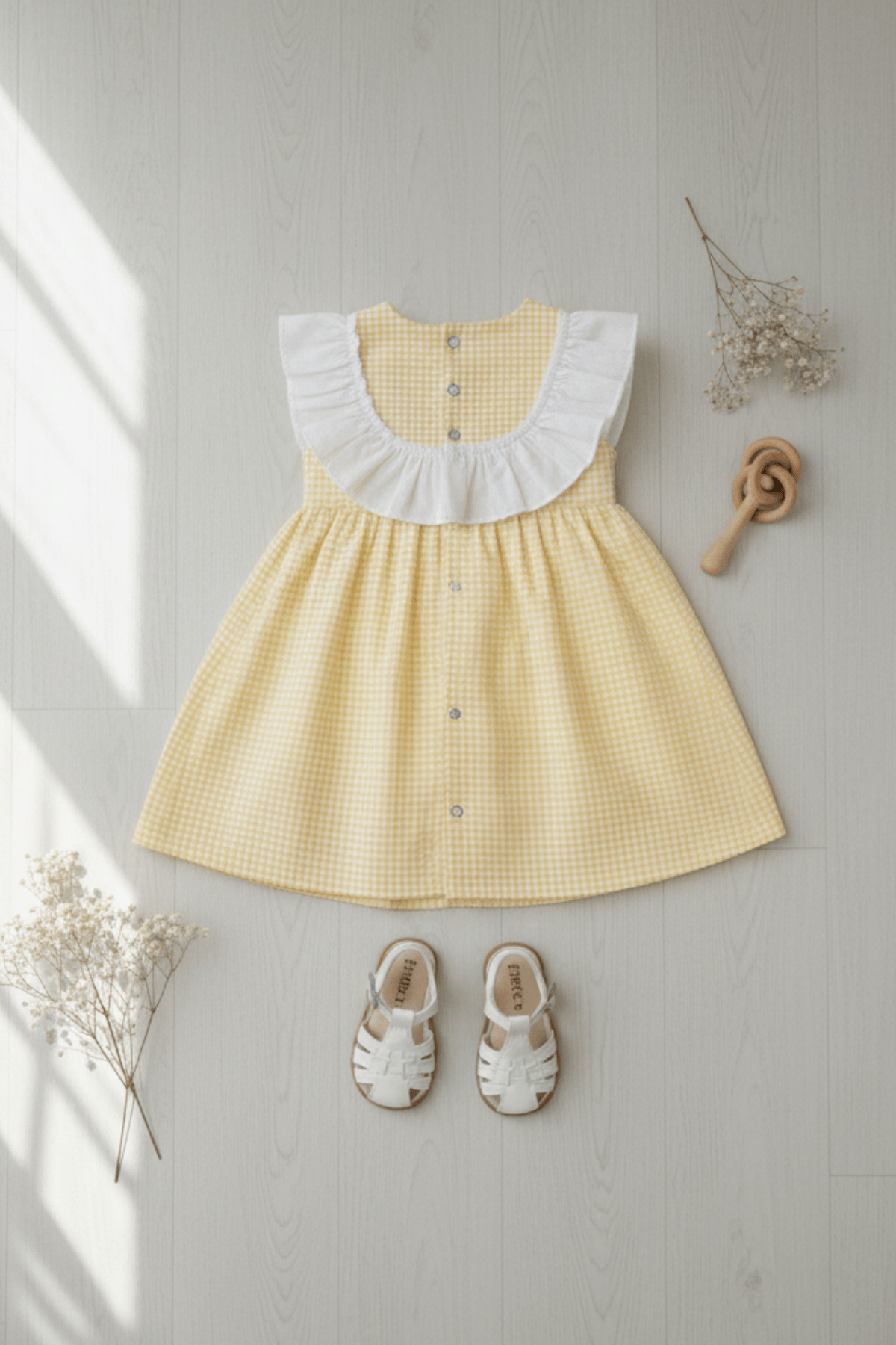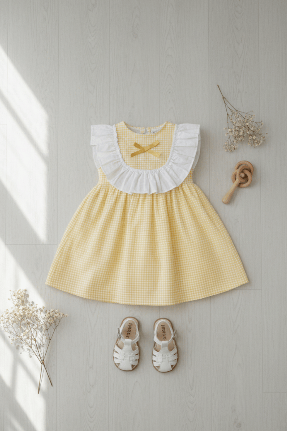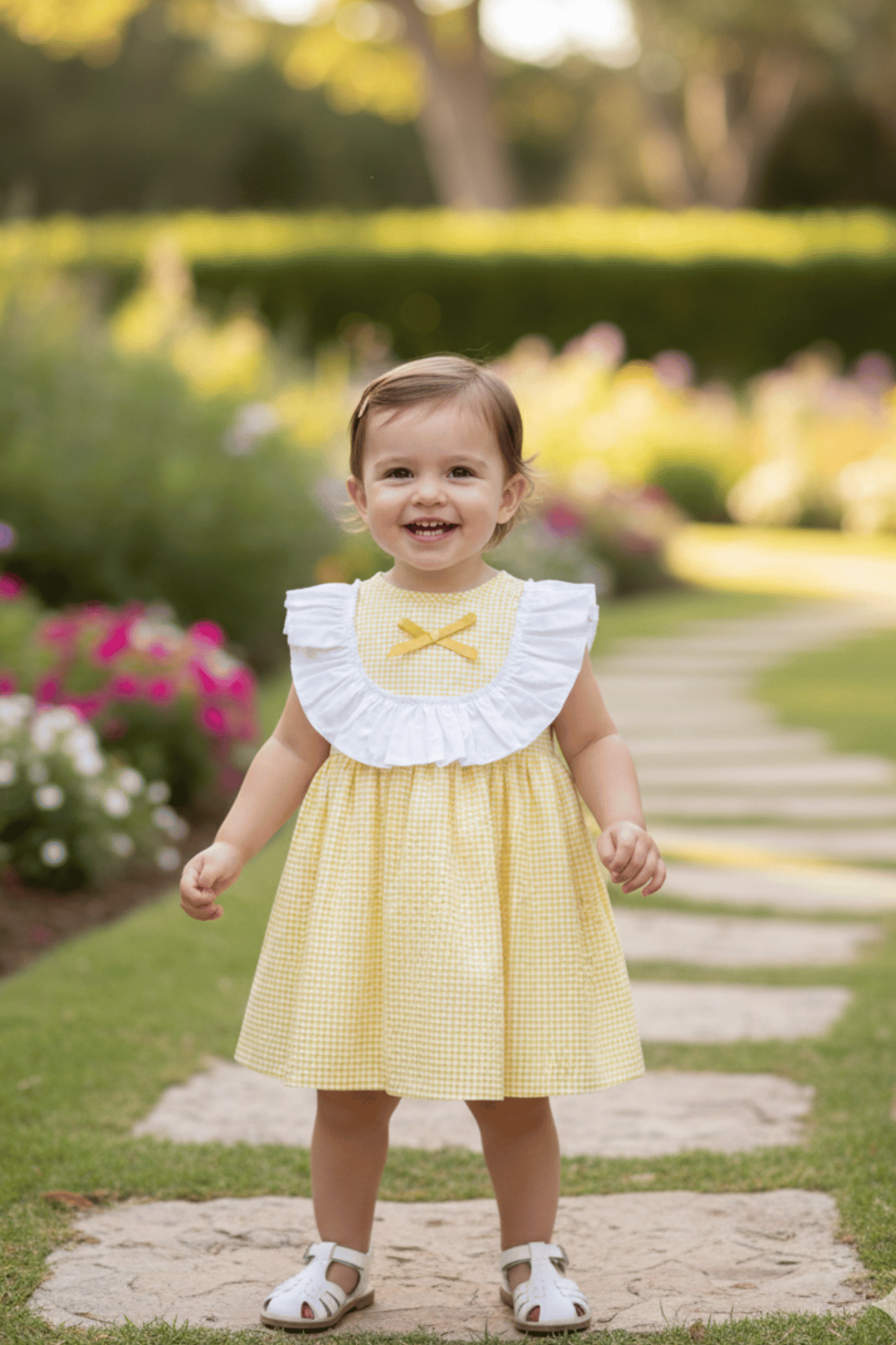 Klasik pötikare deseninin zarafetiyle tasarlanan bu kolsuz elbise, miniklerin konforu düşünülerek en kaliteli pamuklu kumaşlardan üretilmiştir. Canlı sarı ve temiz beyazın uyumu, çocuklarınıza hem enerjik hem de şık bir görünüm kazandırır.
