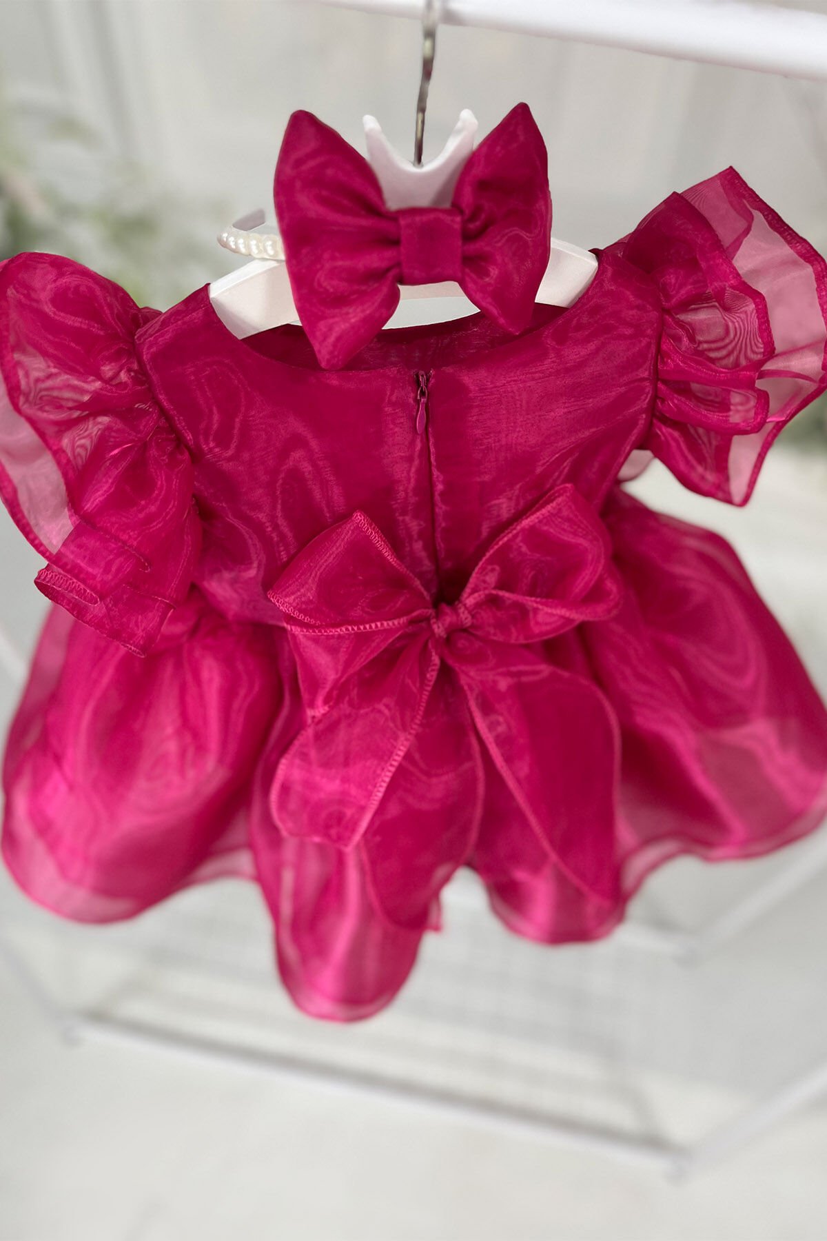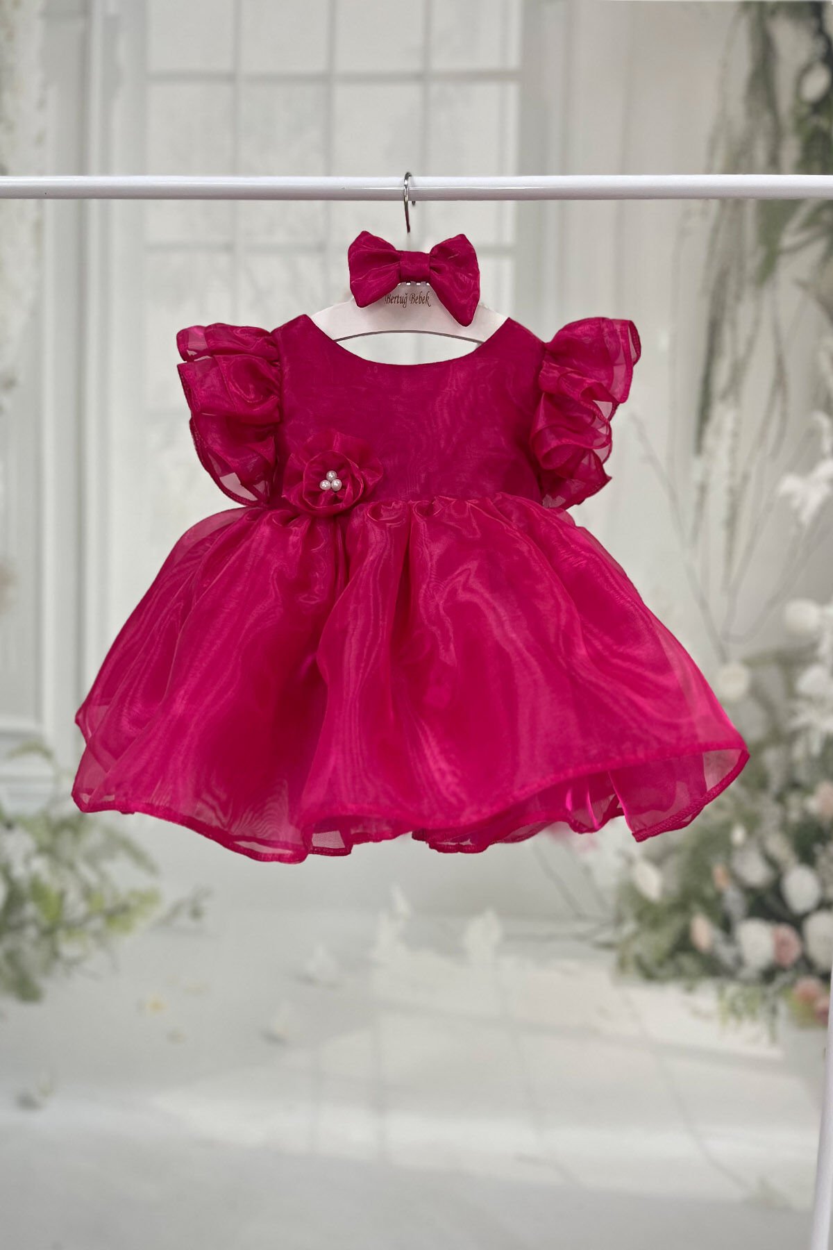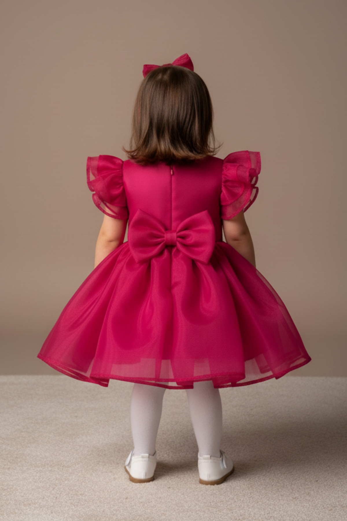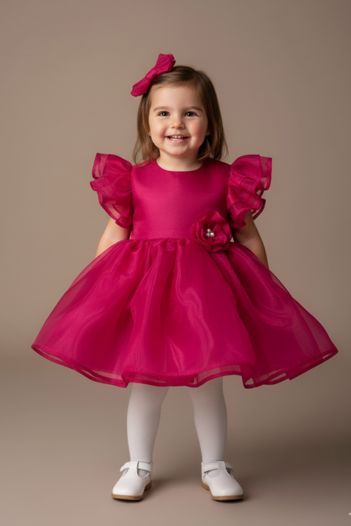 Minik prensesinizin en hareketli anlarına eşlik edecek göz kamaştırıcı bir tasarım! Fuşyanın enerjisiyle parlayan bu organze abiye elbise, doğum günü, düğün gibi tüm özel davetlerin yıldızı olmaya aday.