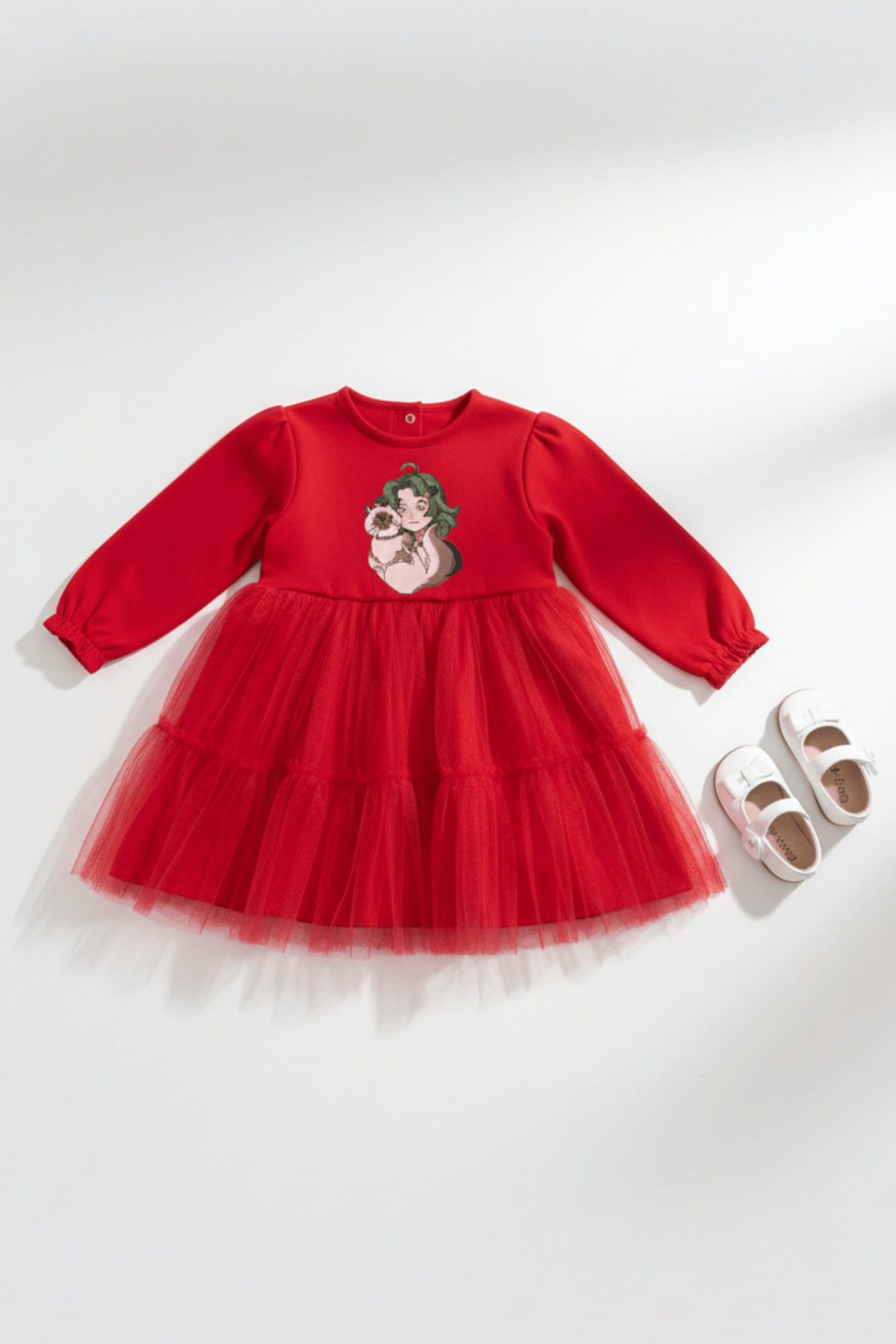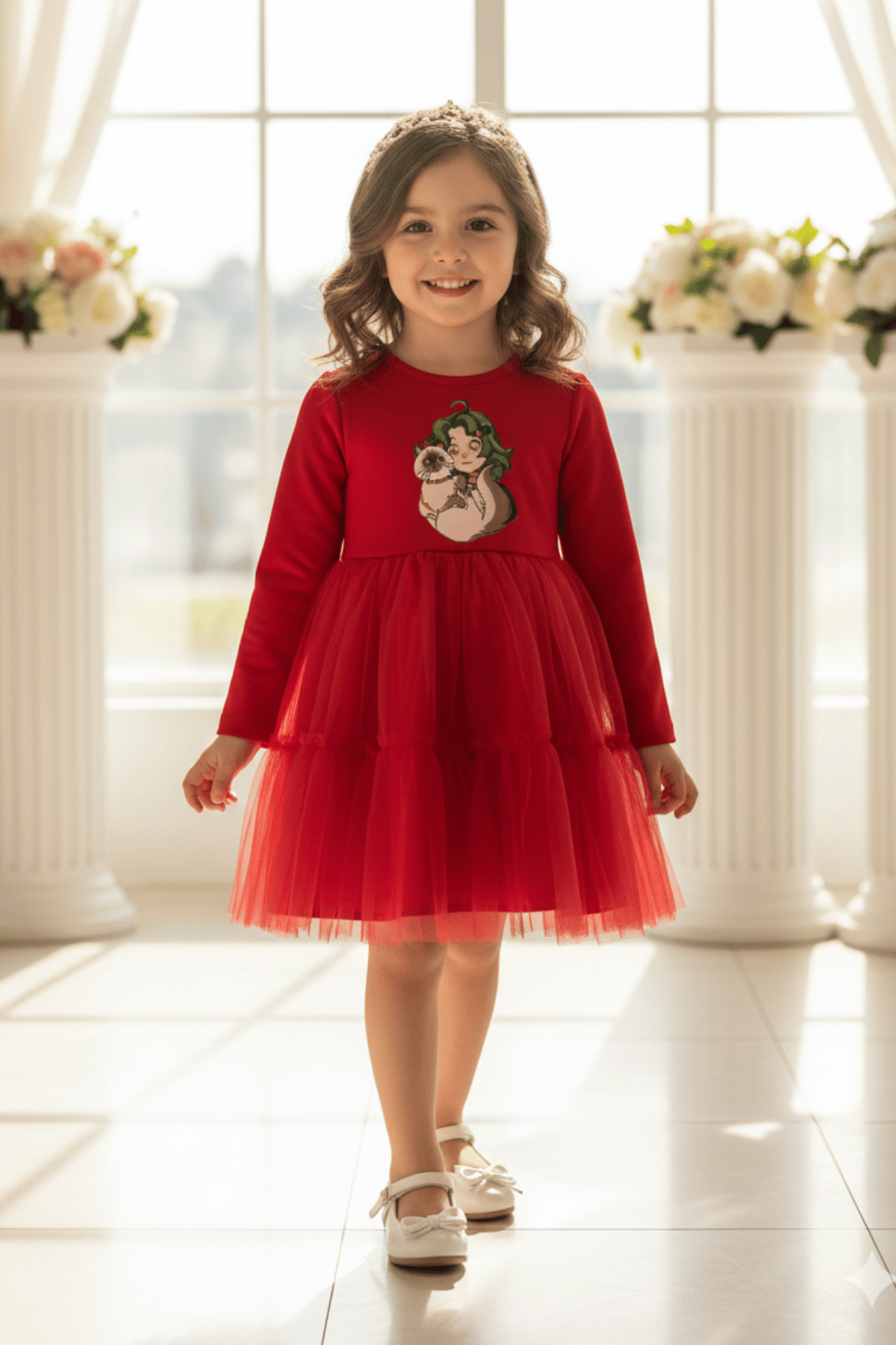 Küçük prenseslerin özel günlerinde hem şıklığı hem de konforu bir arada sunan bu tasarım, her detayında özenli bir işçilik barındırıyor. Canlı kırmızı tonu ve krep kumaşın asil duruşuyla bu elbise, doğum günlerinden bayramlara kadar tüm kutlamaların yıldızı olacak.