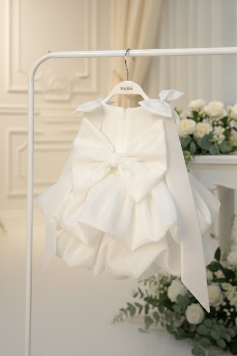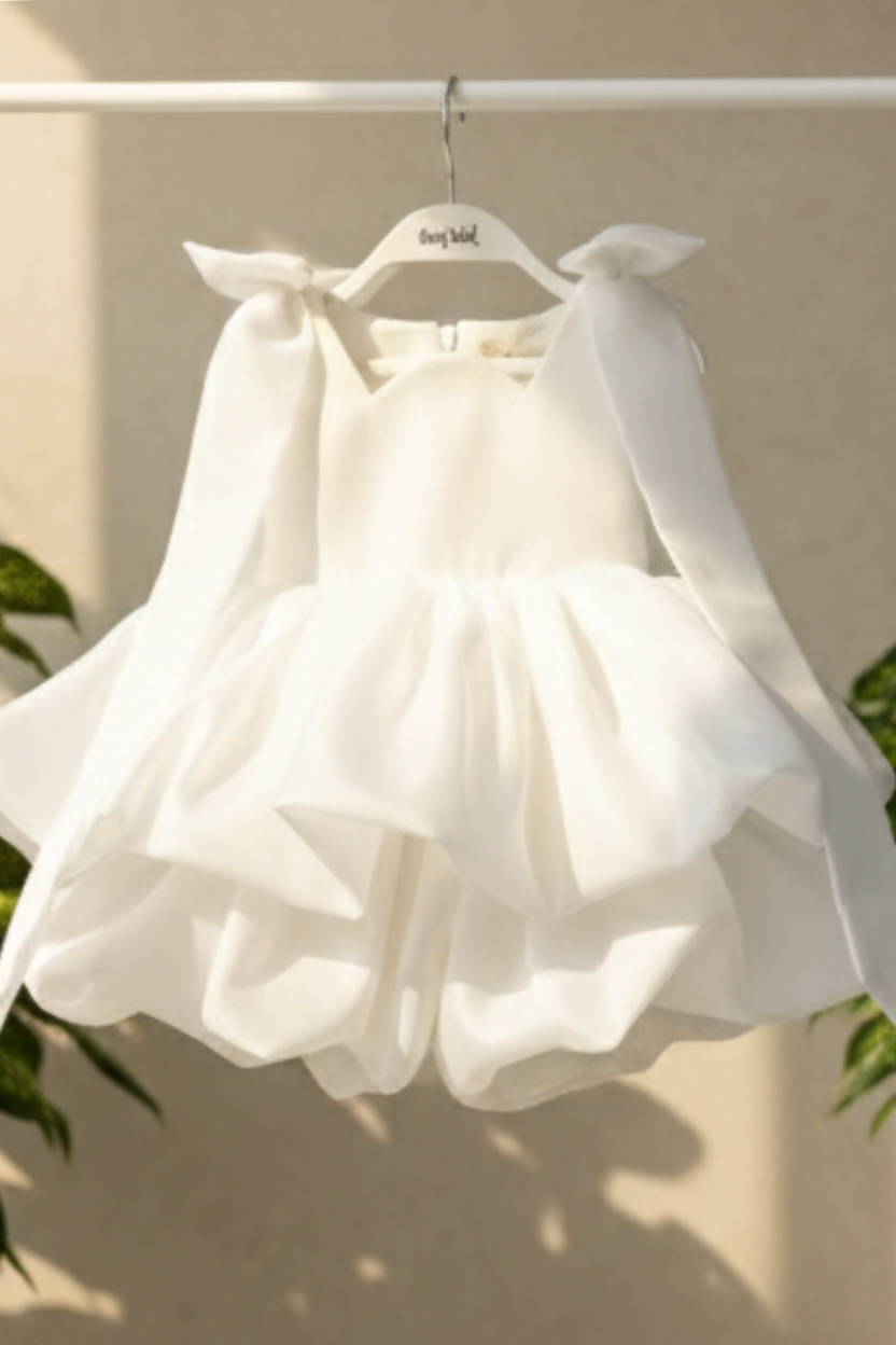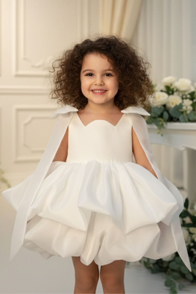 Bu balon etekli, fiyonk ve kuyruk süslemeli kırık beyaz abiye elbise ile çocuğunuzun en özel günlerinde unutulmaz bir şıklık yaşamasını sağlayın. Şimdi sipariş verin ve hayalinizdeki zarafeti gerçeğe dönüştürün!
