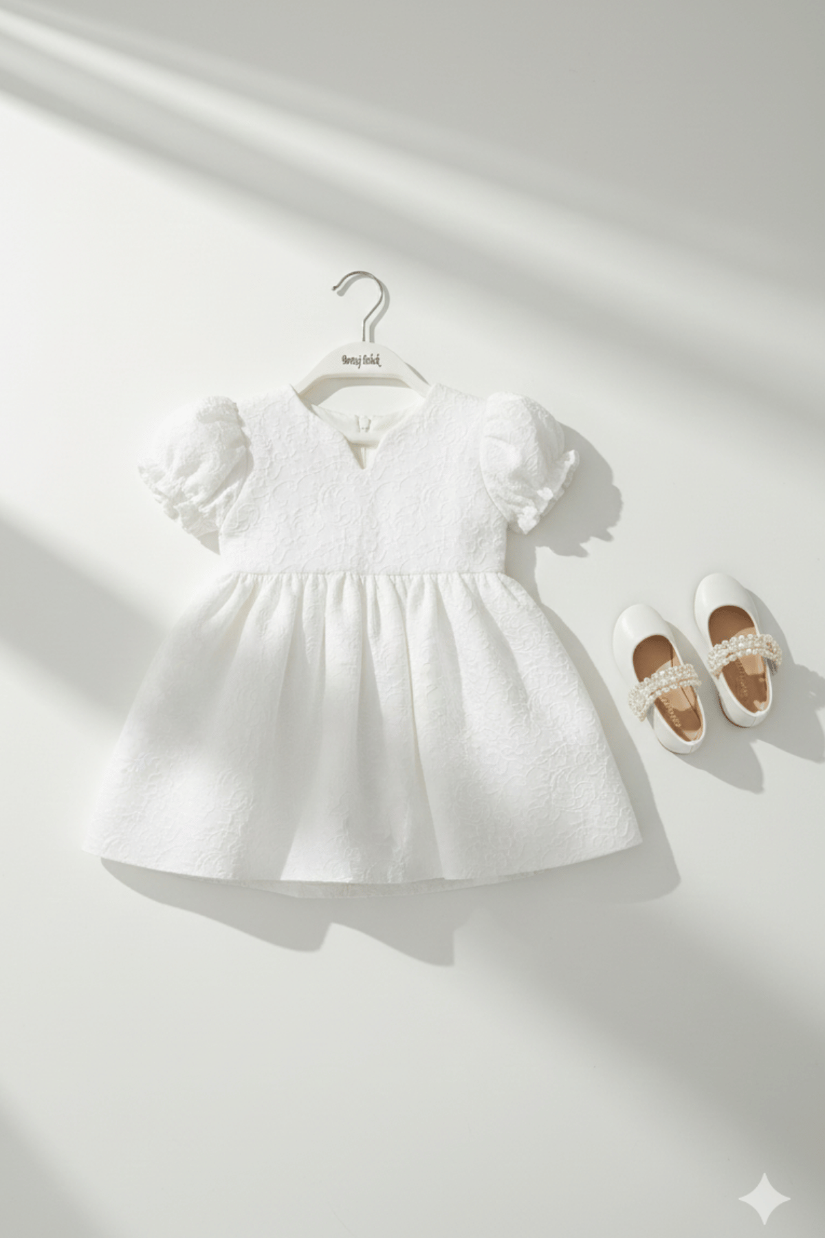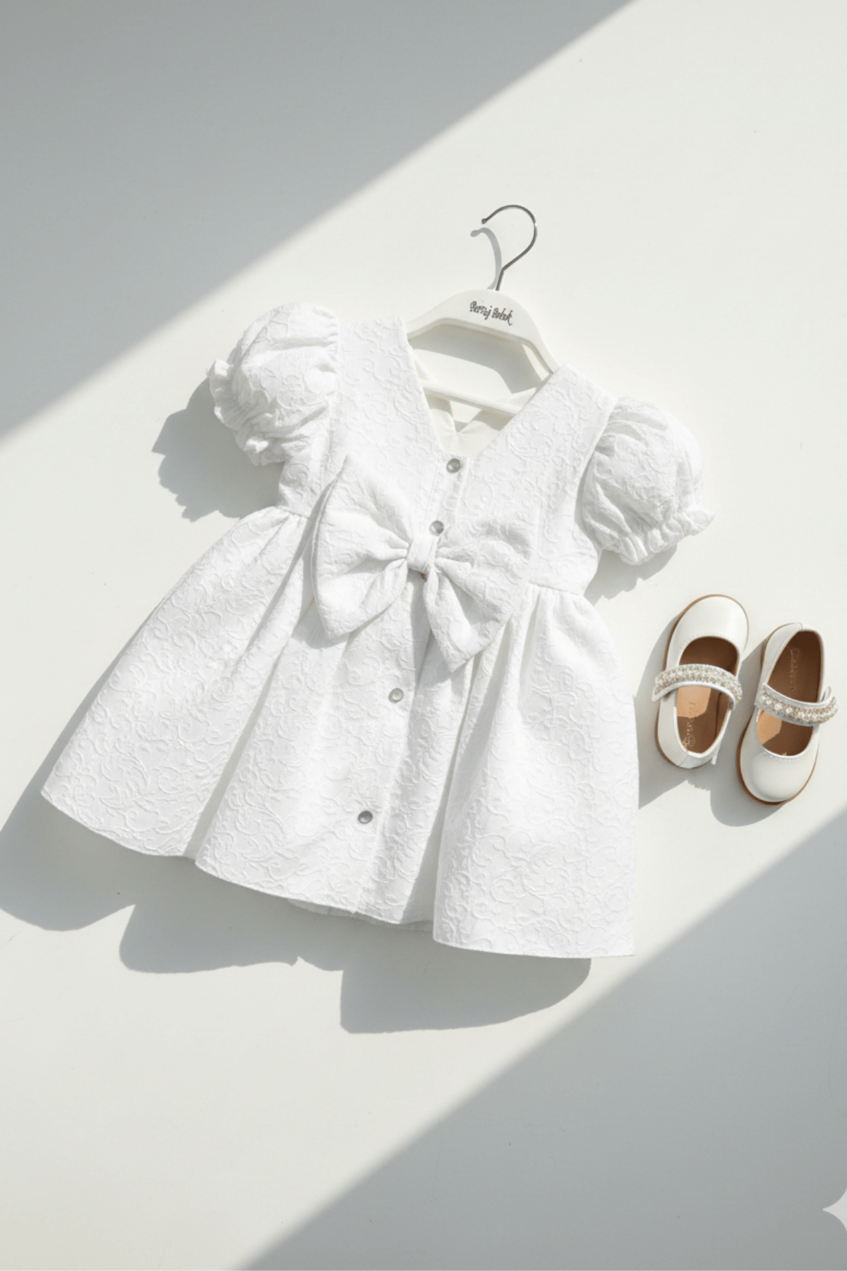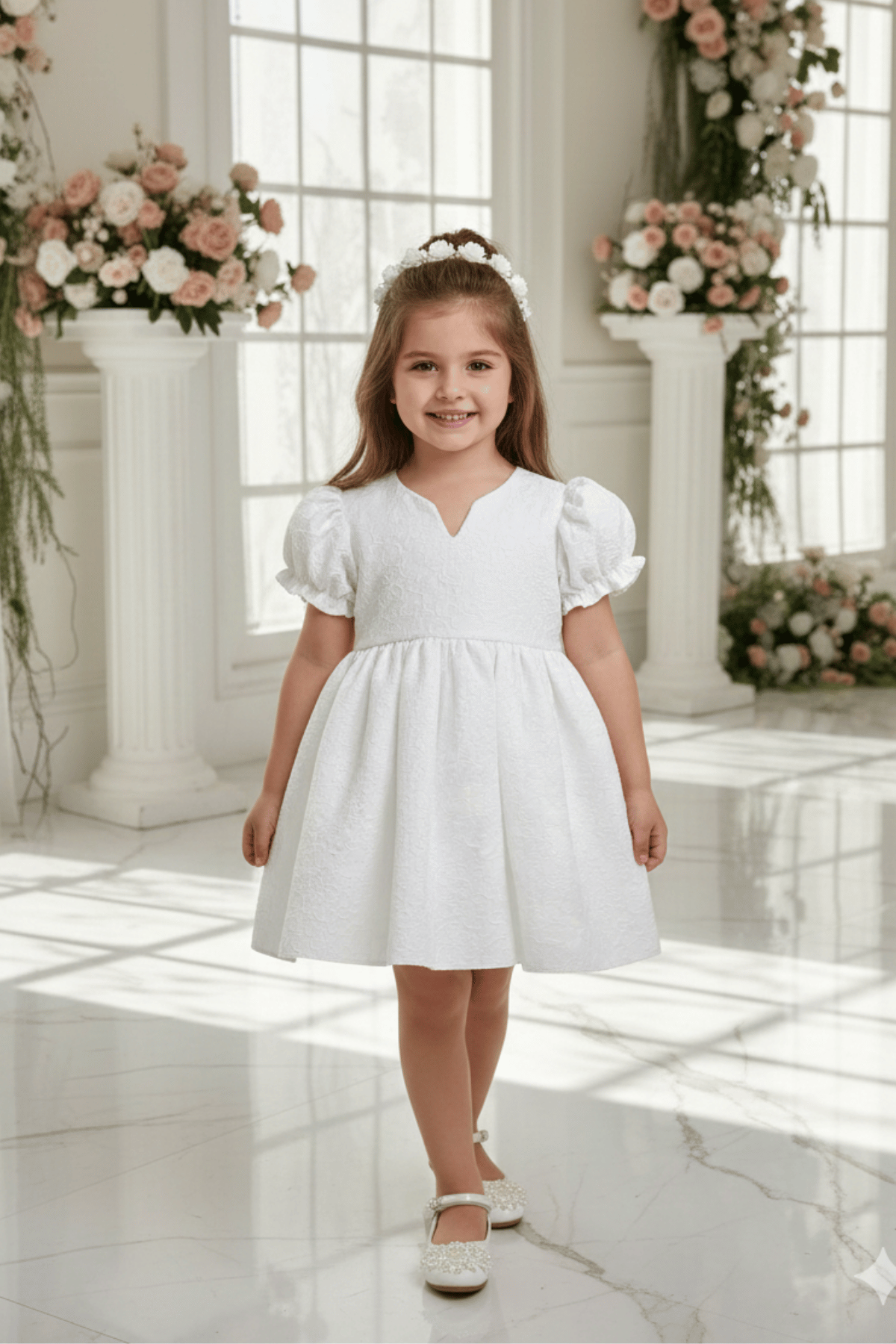 Küçük hanımların gardırobu için hem klasik hem de modern bir dokunuş. Bu beyaz kısa kollu elbise, sofistike kabartma desenleri ve fonksiyonel detaylarıyla özel günlerden şık pazar gezmelerine kadar her an için kusursuz bir seçim.