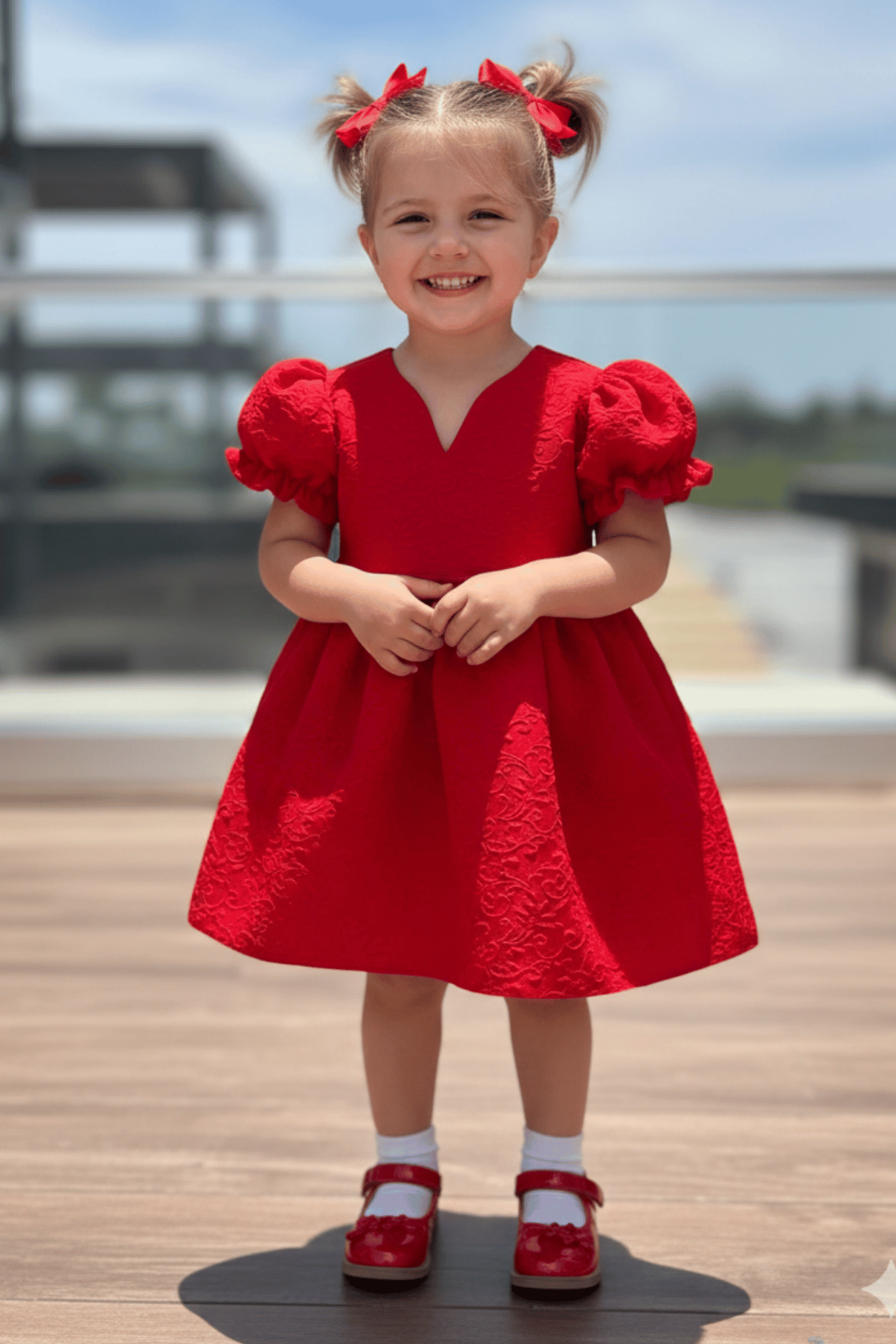 Kız Çocuk Kabartmalı Kumaş Abiye Elbise - Canlı Kırmızı