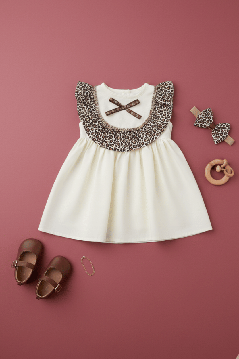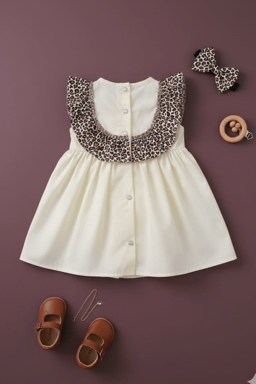 Kız Çocuk Leopar Fırfır Detaylı Pamuklu Ekru Yazlık Elbise