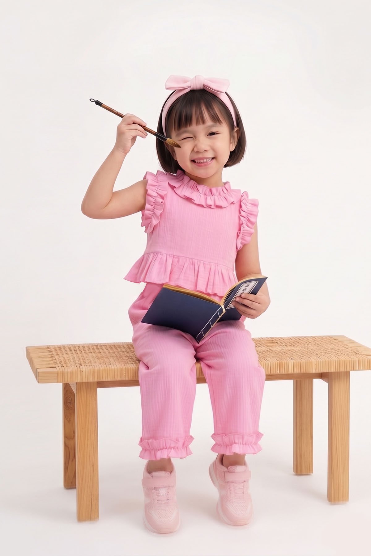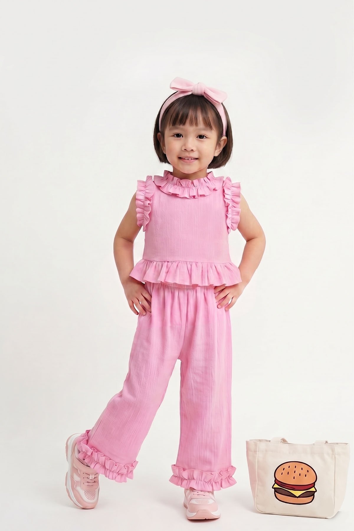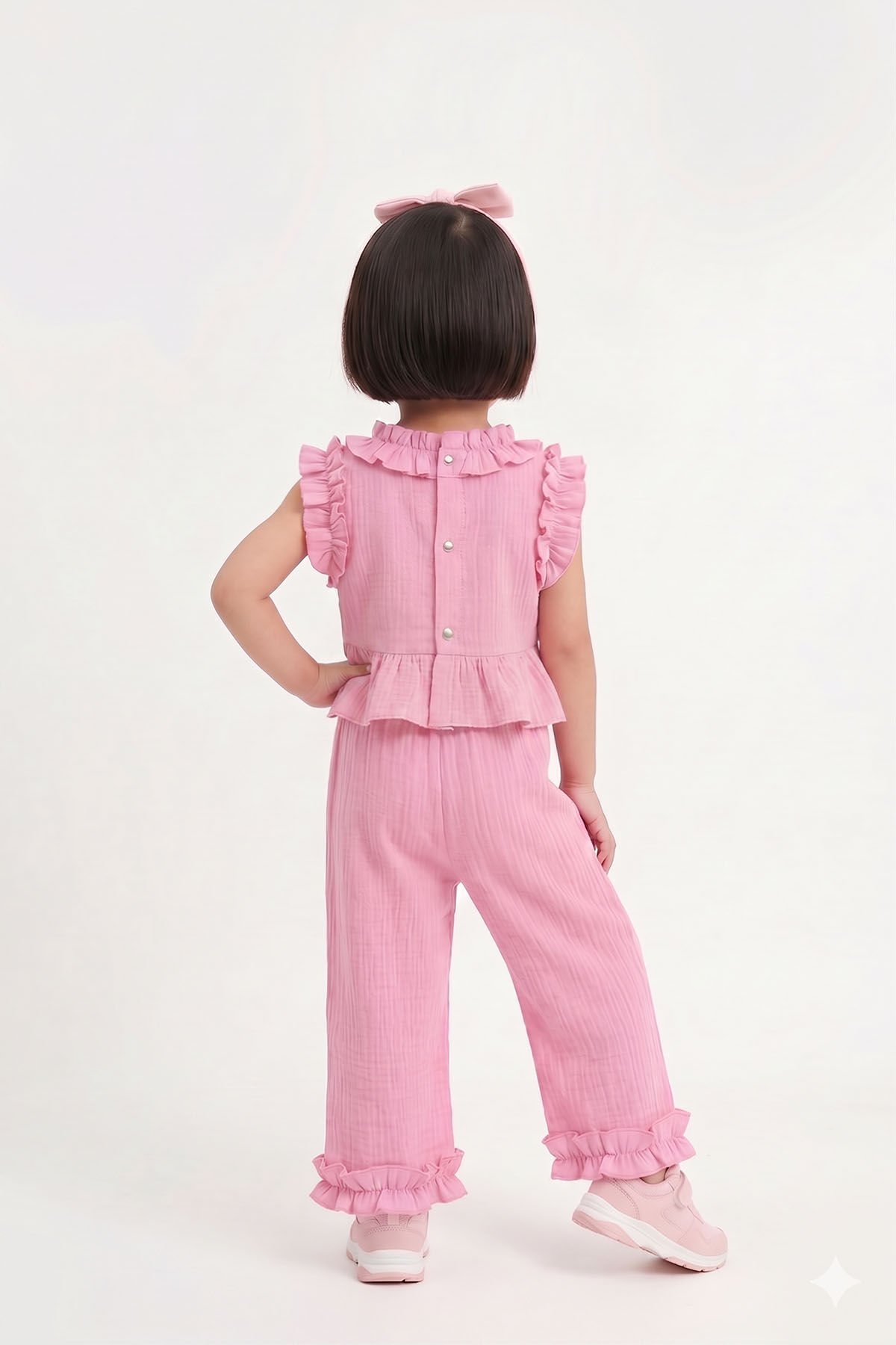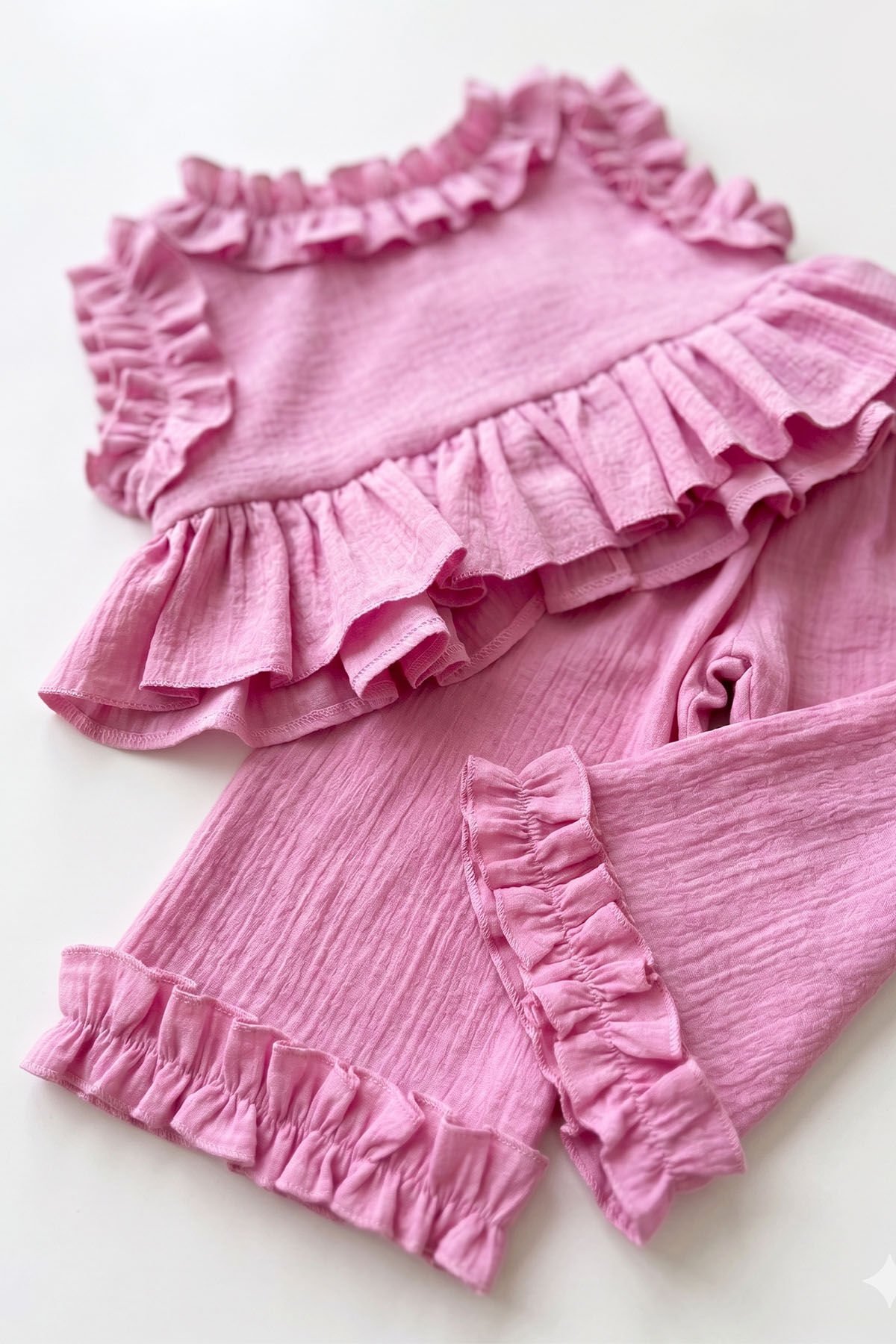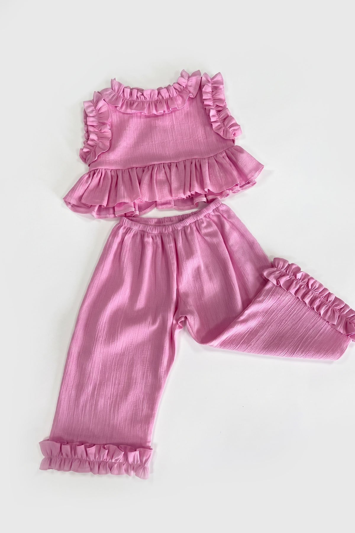 %100 pamuklu Şile bezi kumaştan üretilen pembe takımımız, zarif fırfır detaylarıyla bebeğinize hem konfor hem de şirin bir görünüm sunar. Nefes alabilen doğal yapısı sayesinde hassas bebek cildi için idealdir ve gün boyu rahat bir kullanım sağlar.