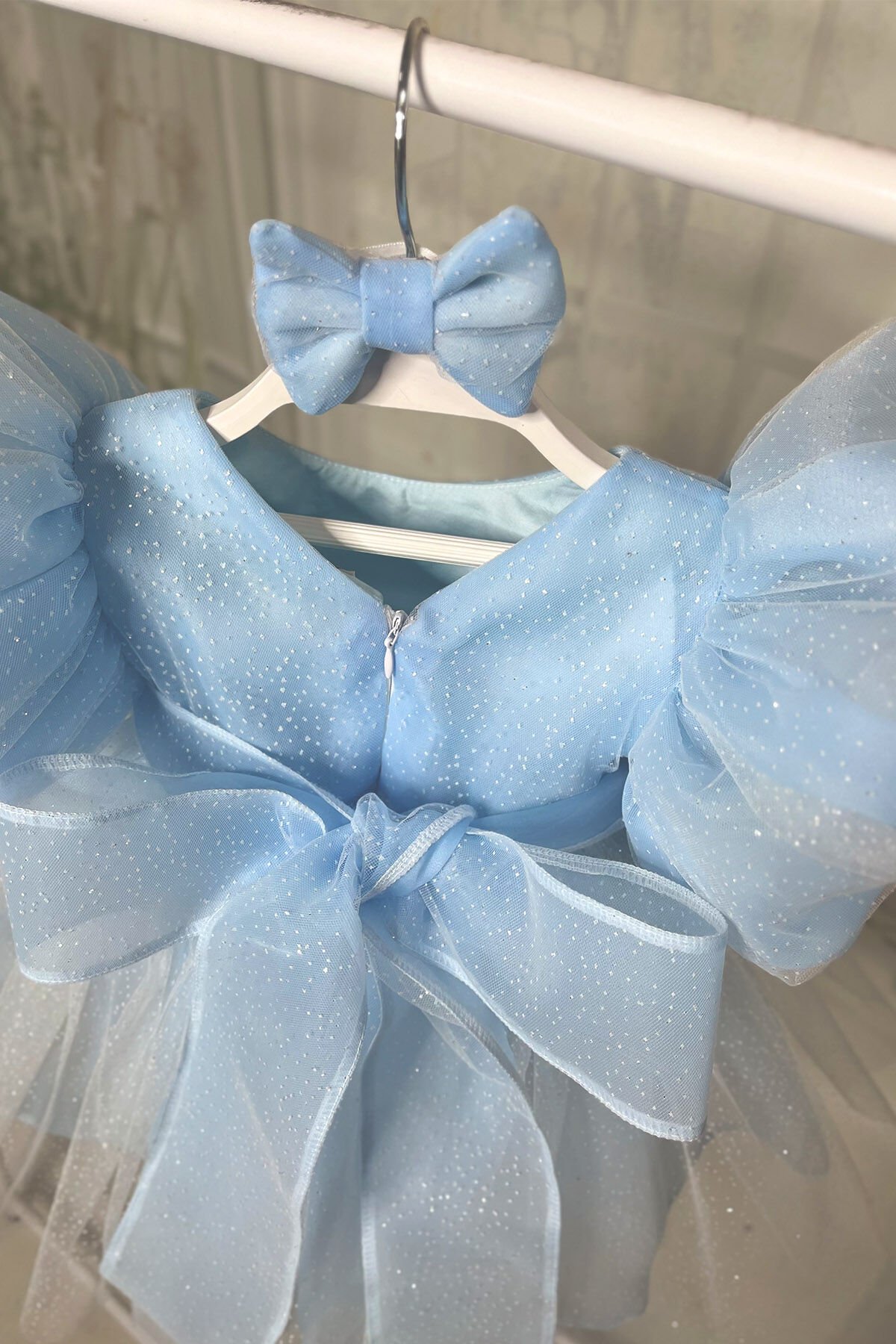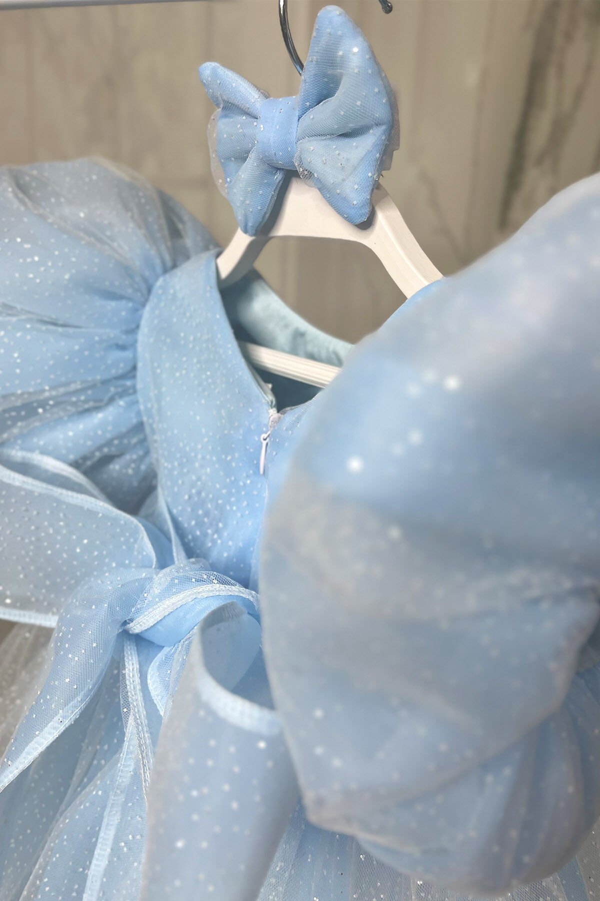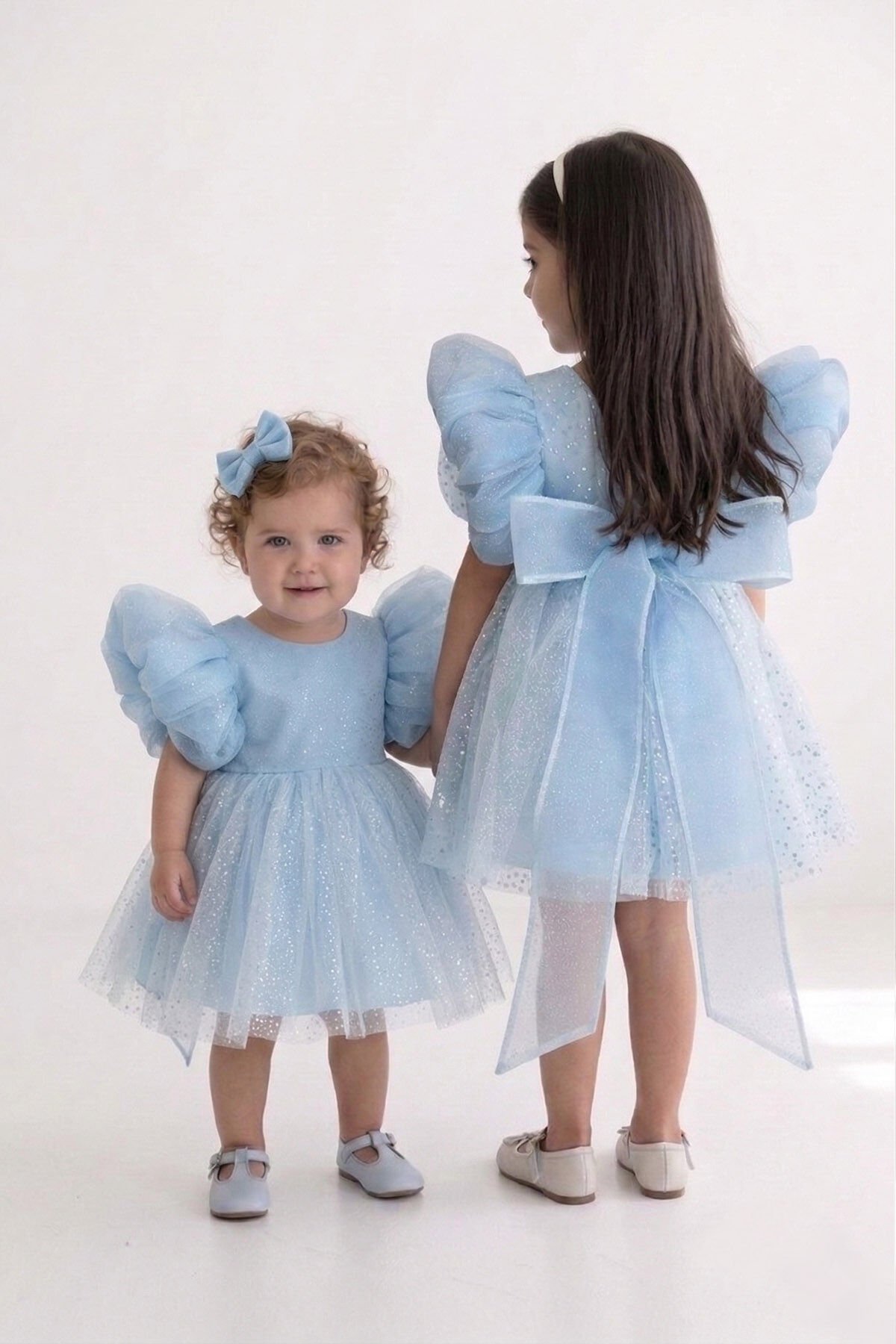 Göz Alıcı Detaylar: Kabarık balon kollar ve arkada elbiseye derinlik katan, uçuş uçuş büyük organze fiyonk.