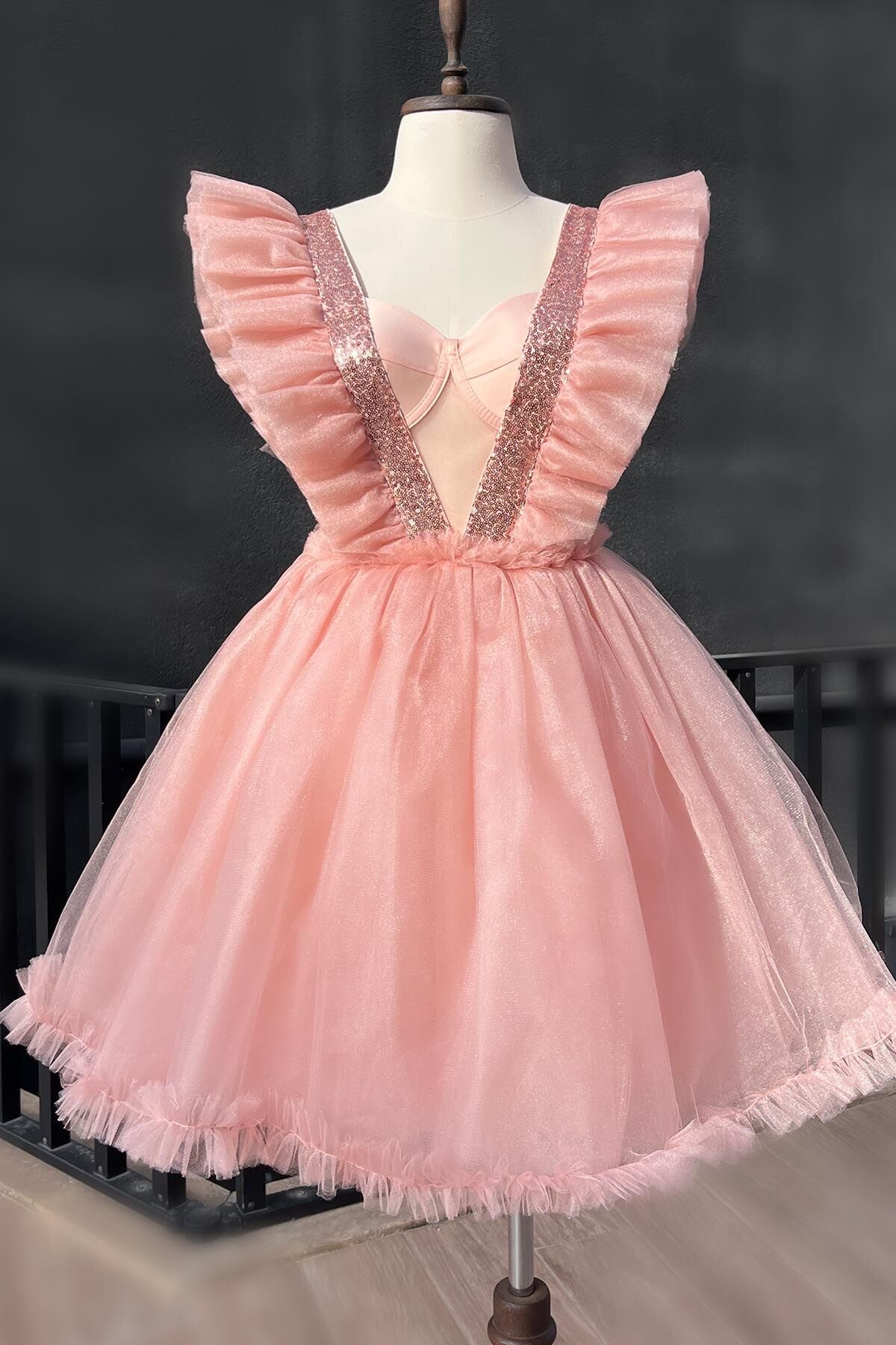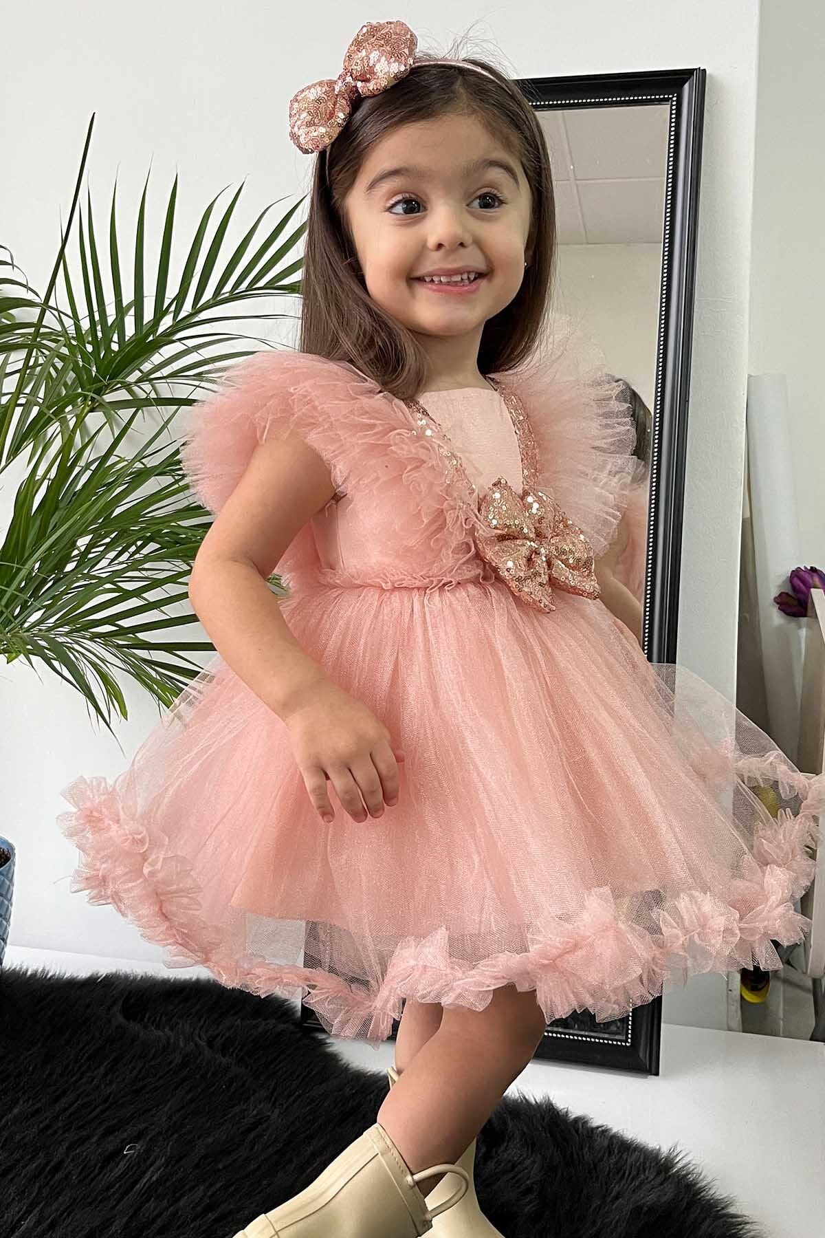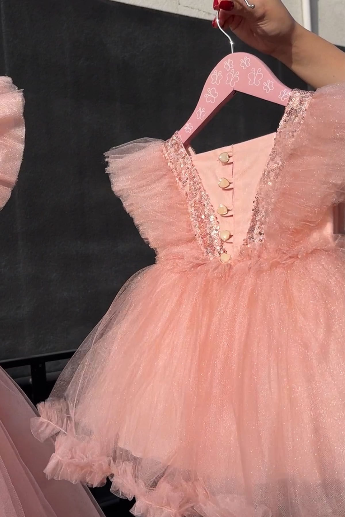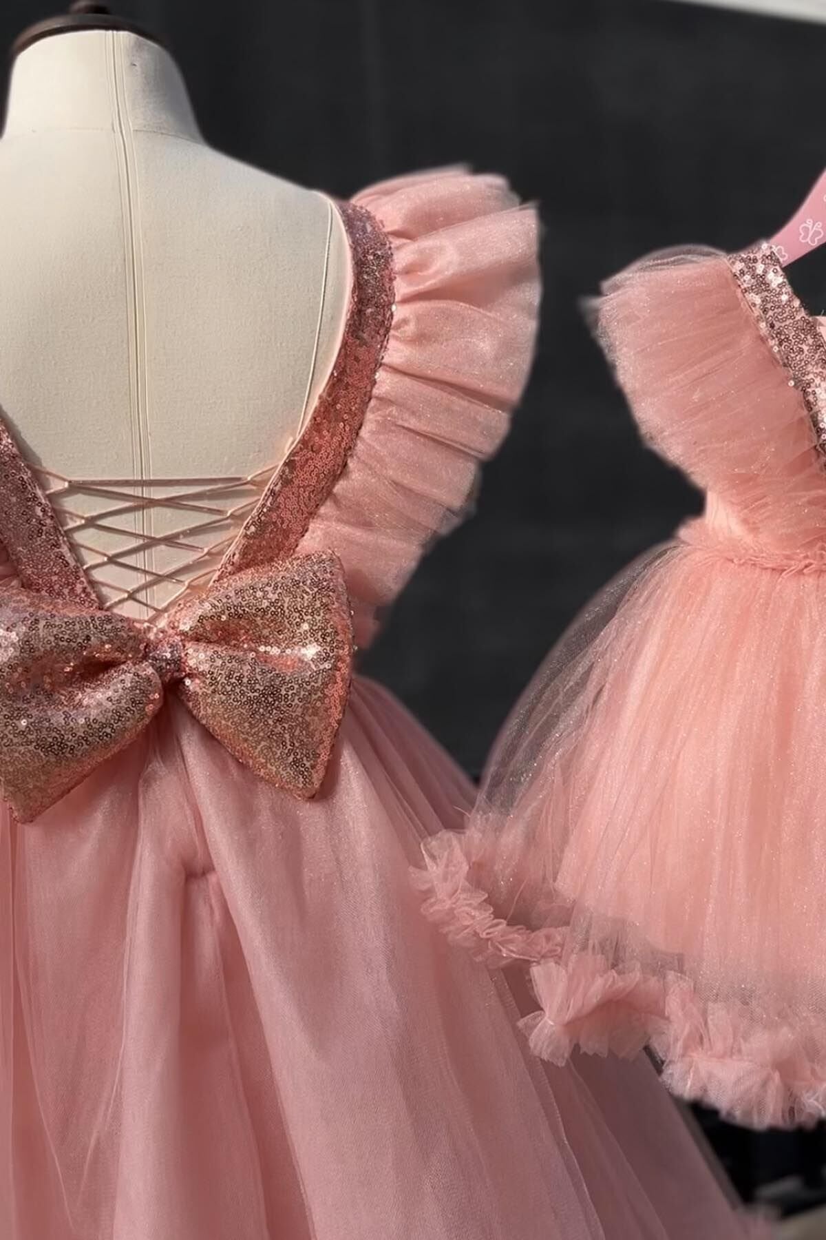 Kat kat tül ve pul payet geçişli beden süslemesi, etek ucu fırfırı ve kabarık eteği ile doğum günü , parti, balo ve diğer tüm özel günlerinizde minikleriniz ile kombinleyebileceğiniz Somon Kristal Abiye Modelimiz Özel tasarımdır.